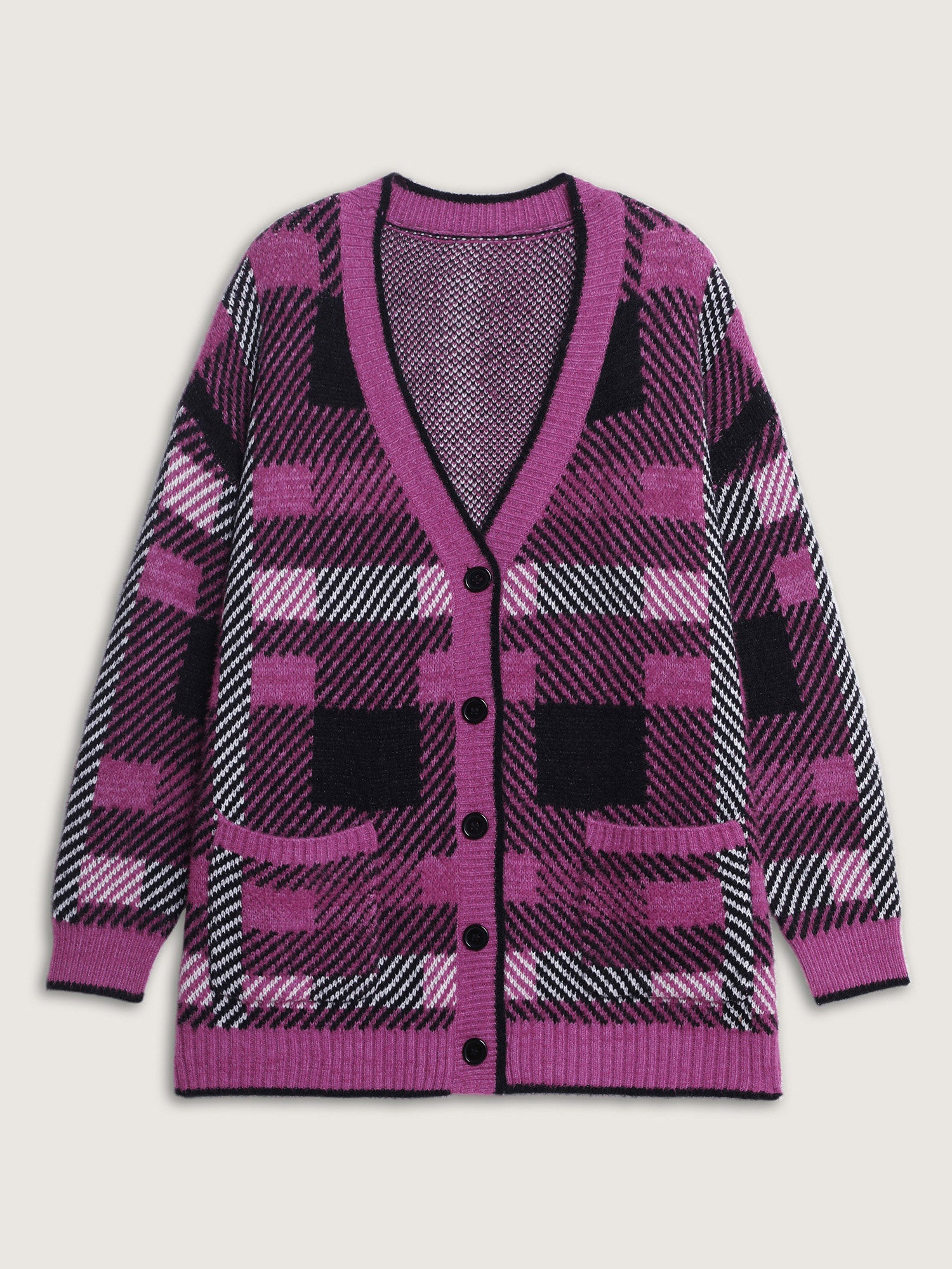 Shop Fuzzy Plaid Pattern Button Knit Cardigan now and redefine your style with confidence at BloomChic. Tailored for mid and plus-size women. This trendy Sweaters Cardigans Women, sizes 10-30. Color:RedViolet;Style:Playful;Neckline:Deep V-neck;Sleeve Type:Drop shoulder sleeve;Prints:Plaid;Pocket:Patch pocket;Belt:No-belt;Closure Type:Button