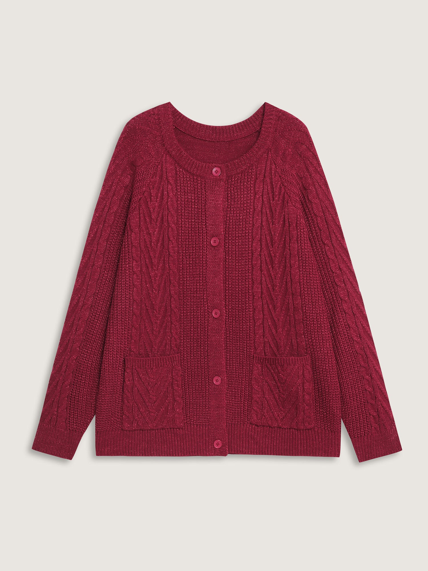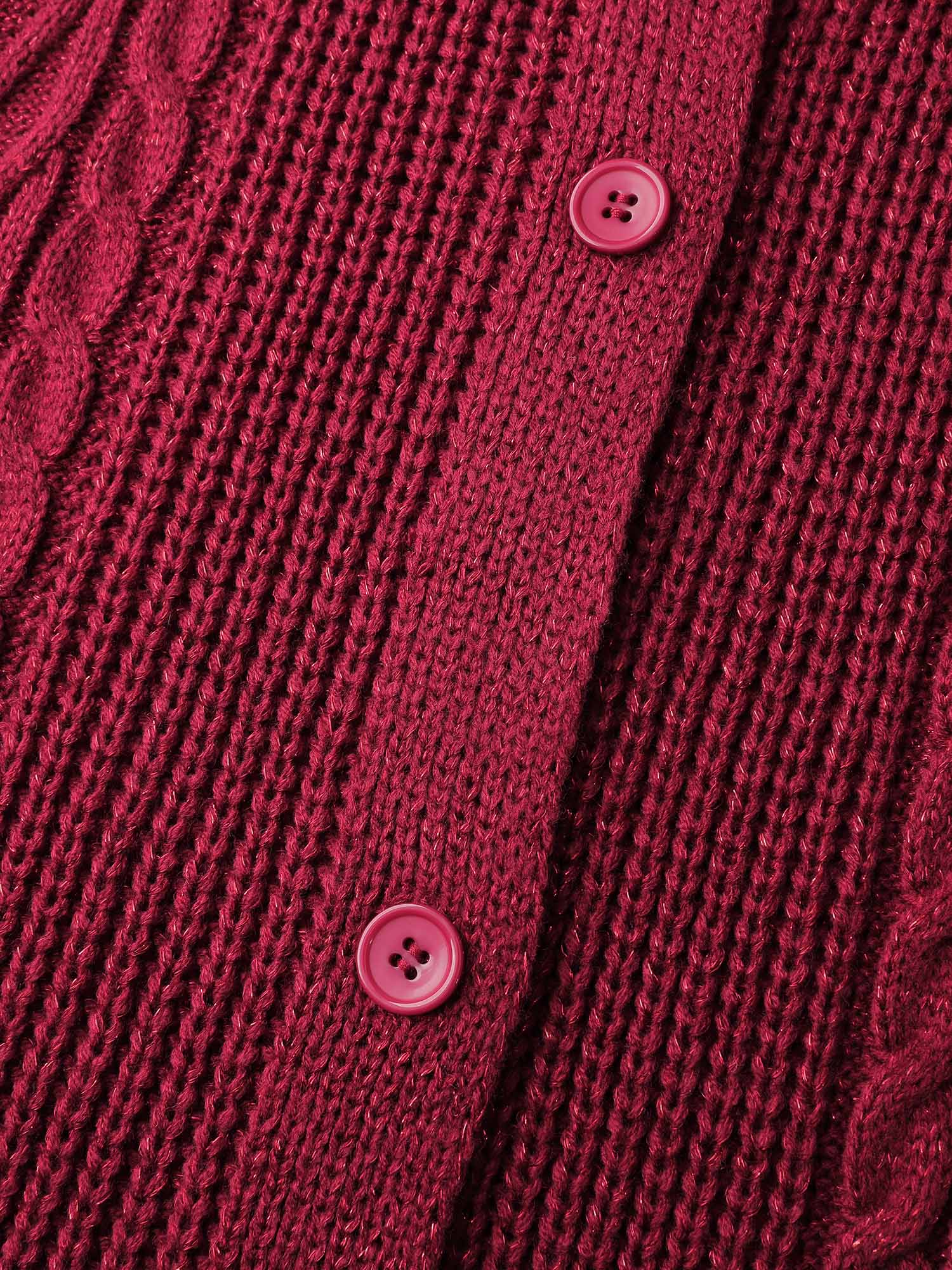 Shop Lurex Twist Button Knit Cardigan now and redefine your style with confidence at BloomChic. Tailored for mid and plus-size women. This trendy Sweaters Cardigans Women, sizes 10-30. Color:Scarlet;Style:Cocktail;Neckline:Round Neck;Sleeve Type:Raglan sleeve;Prints:Non;Details:Button, Texture, Cable Knit;Pocket:Patch pocket;Belt:No-belt;Closure Type:Button