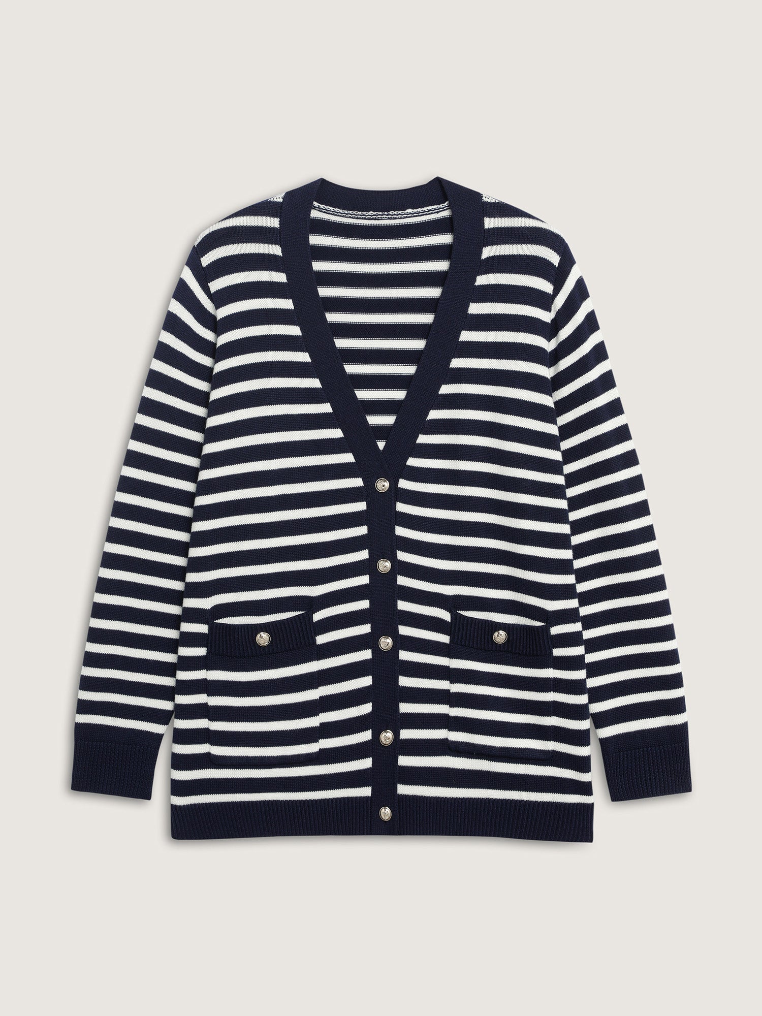 Wool-Blend Stripe Button Pockets Knit Cardigan