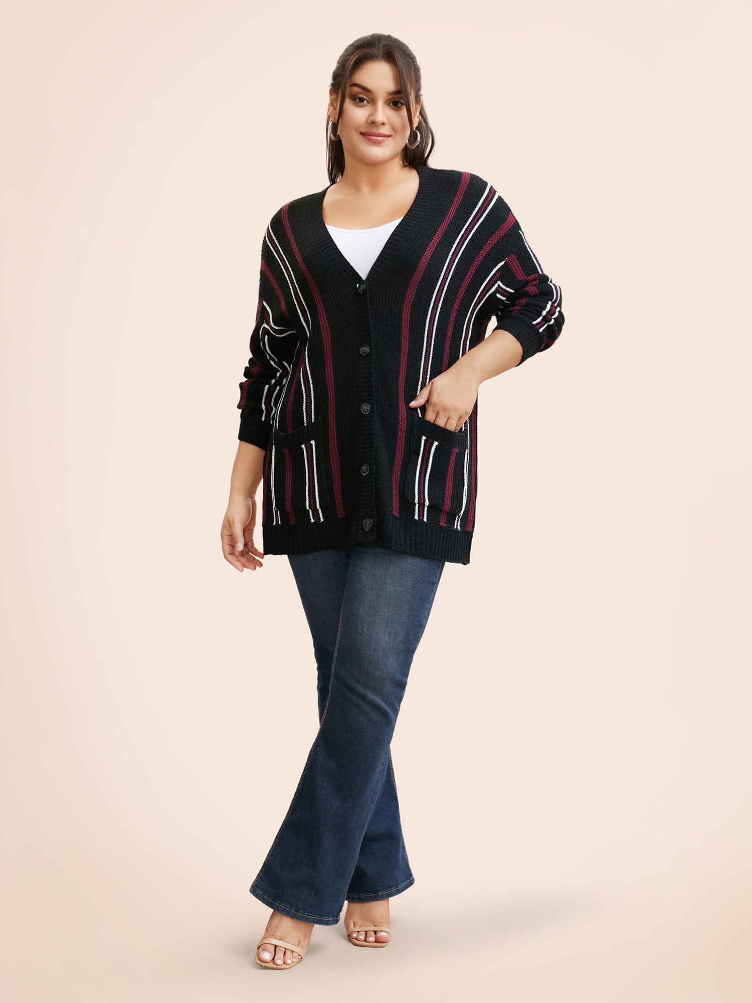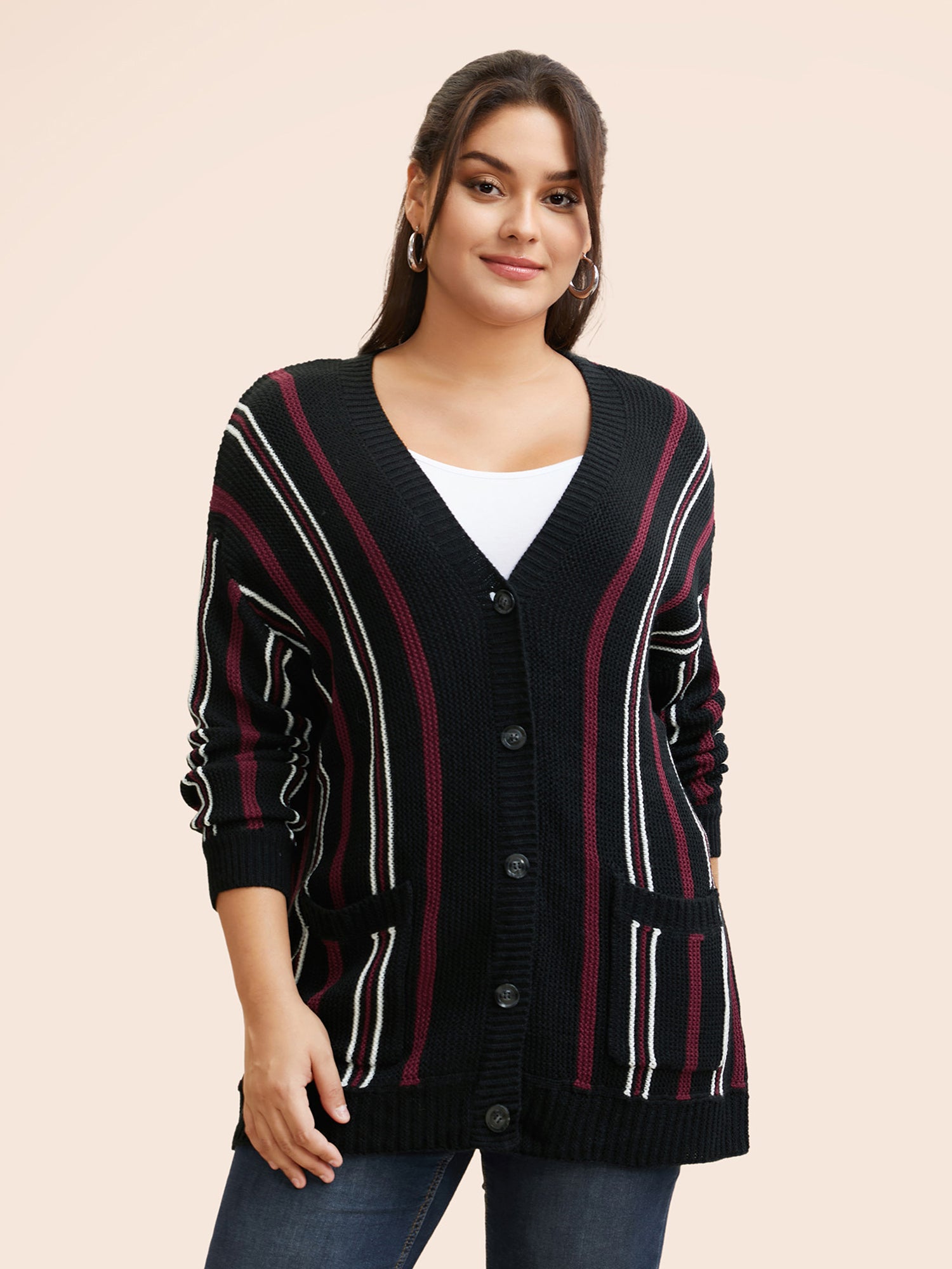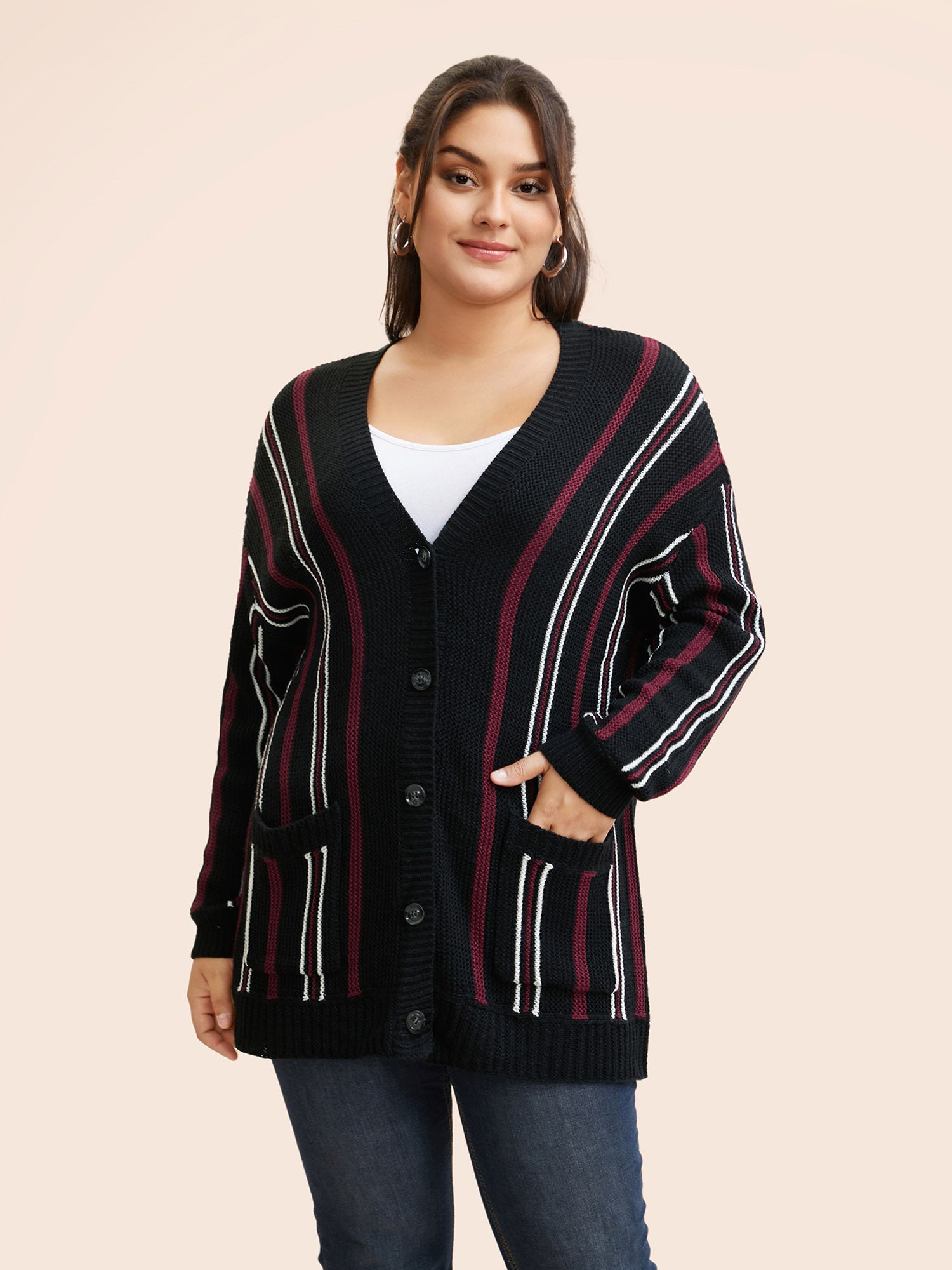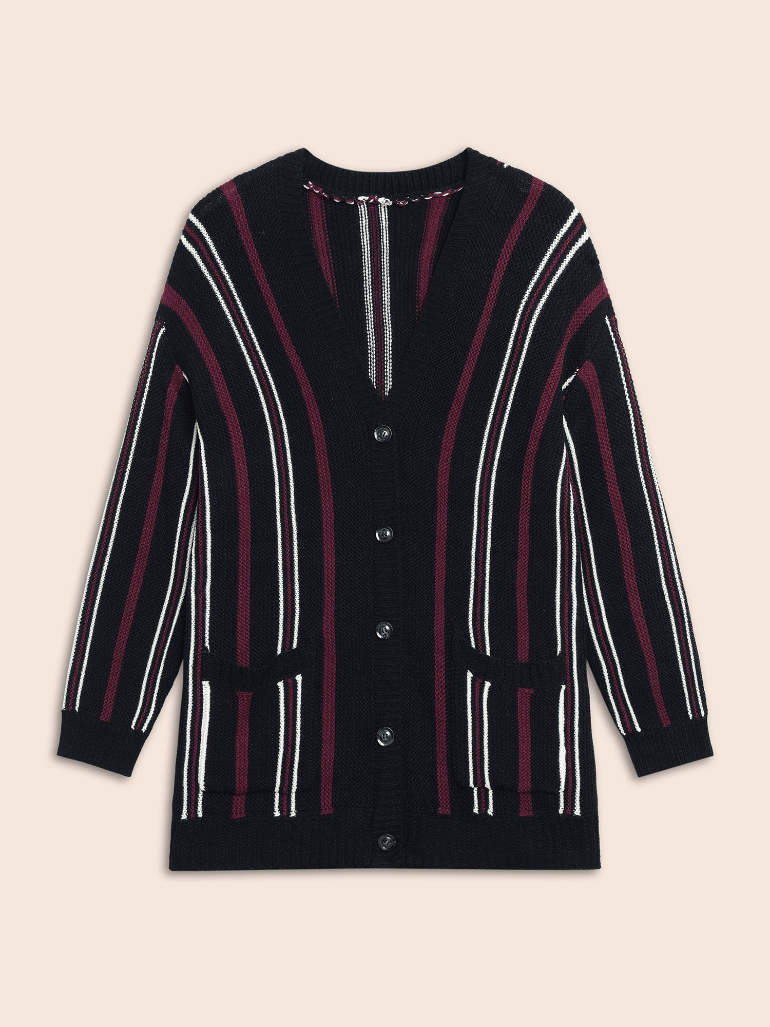 Shop Striped Patched Pocket Drop Shoulder Cardigan now and redefine your style with confidence at BloomChic. Tailored for mid and plus-size women. This trendy Sweaters Cardigans Women, sizes 10-30. Season:Winter;Color:Black;Style:Casual;Neckline:V-neck;Sleeve Type:Drop shoulder sleeve;Prints:Stripes;Details:Button, Contrast;Pocket:Patch pocket;Belt:No-belt;Closure Type:Open front with closure