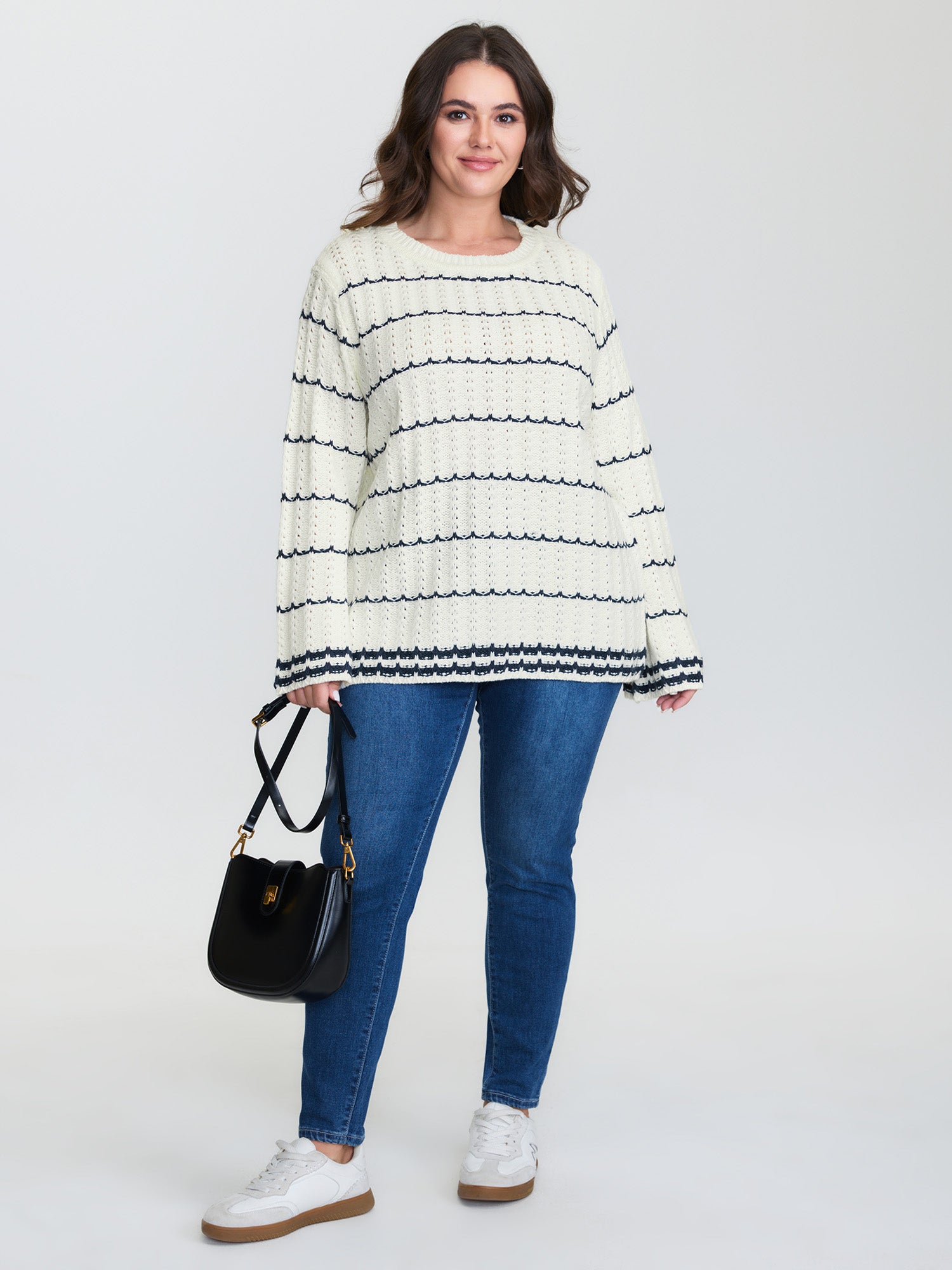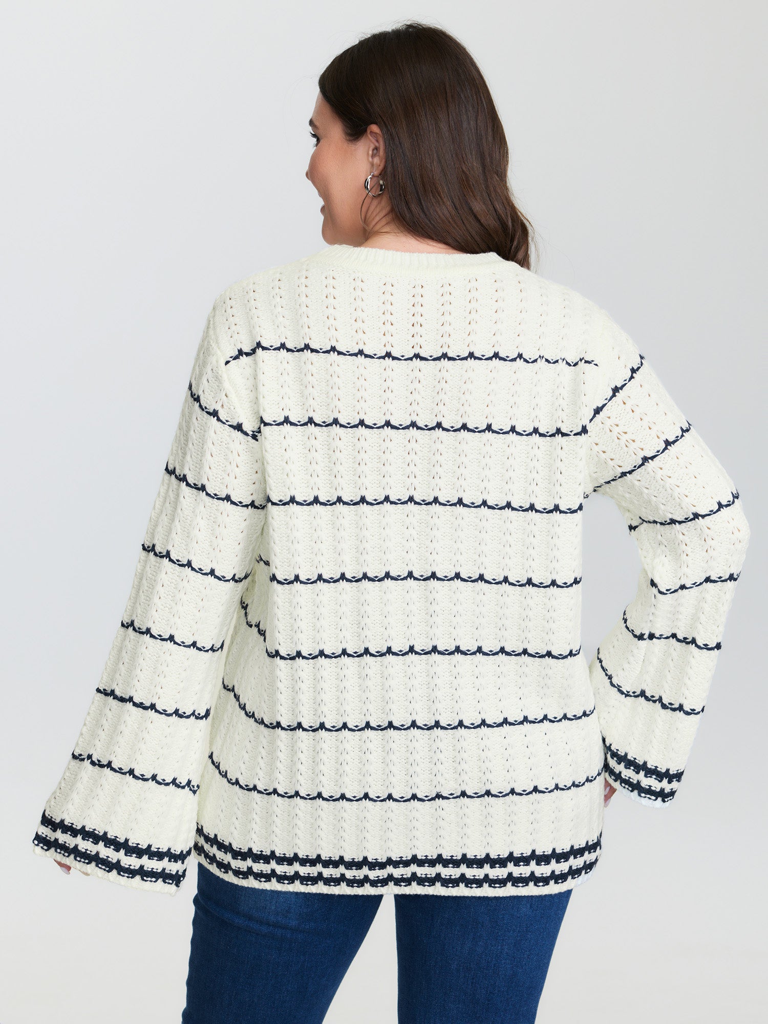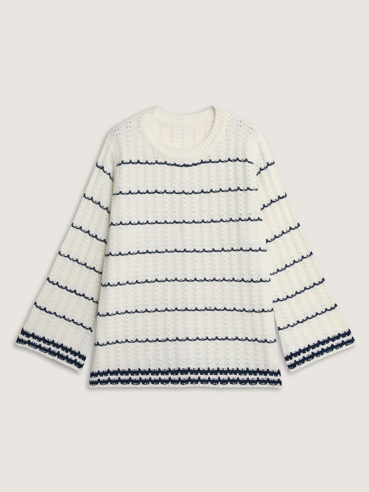Shop Textured Color Stripe Flared Sleeve Pullover now and redefine your style with confidence at BloomChic. Tailored for mid and plus-size women. This trendy Sweaters Cardigans Women, sizes 10-30. Color:Original White;Style:Leisure;Neckline:Round Neck;Sleeve Type:Regular Sleeve;Prints:Stripes;Details:Contrast;Pocket:No-pocket;Belt:No-belt;Closure Type:Non