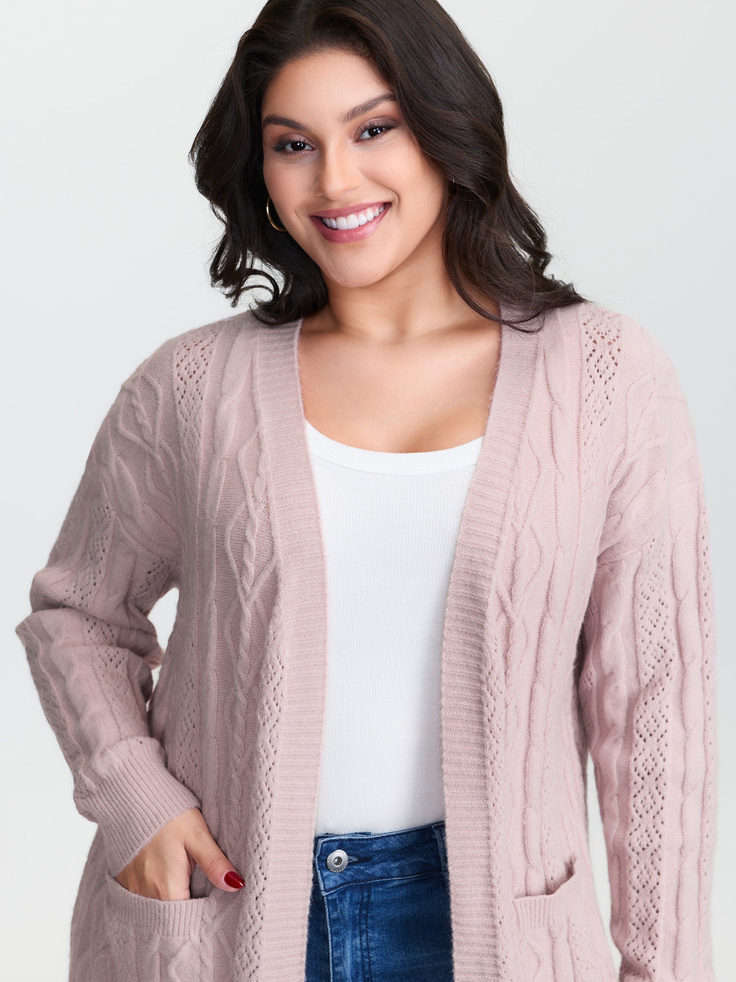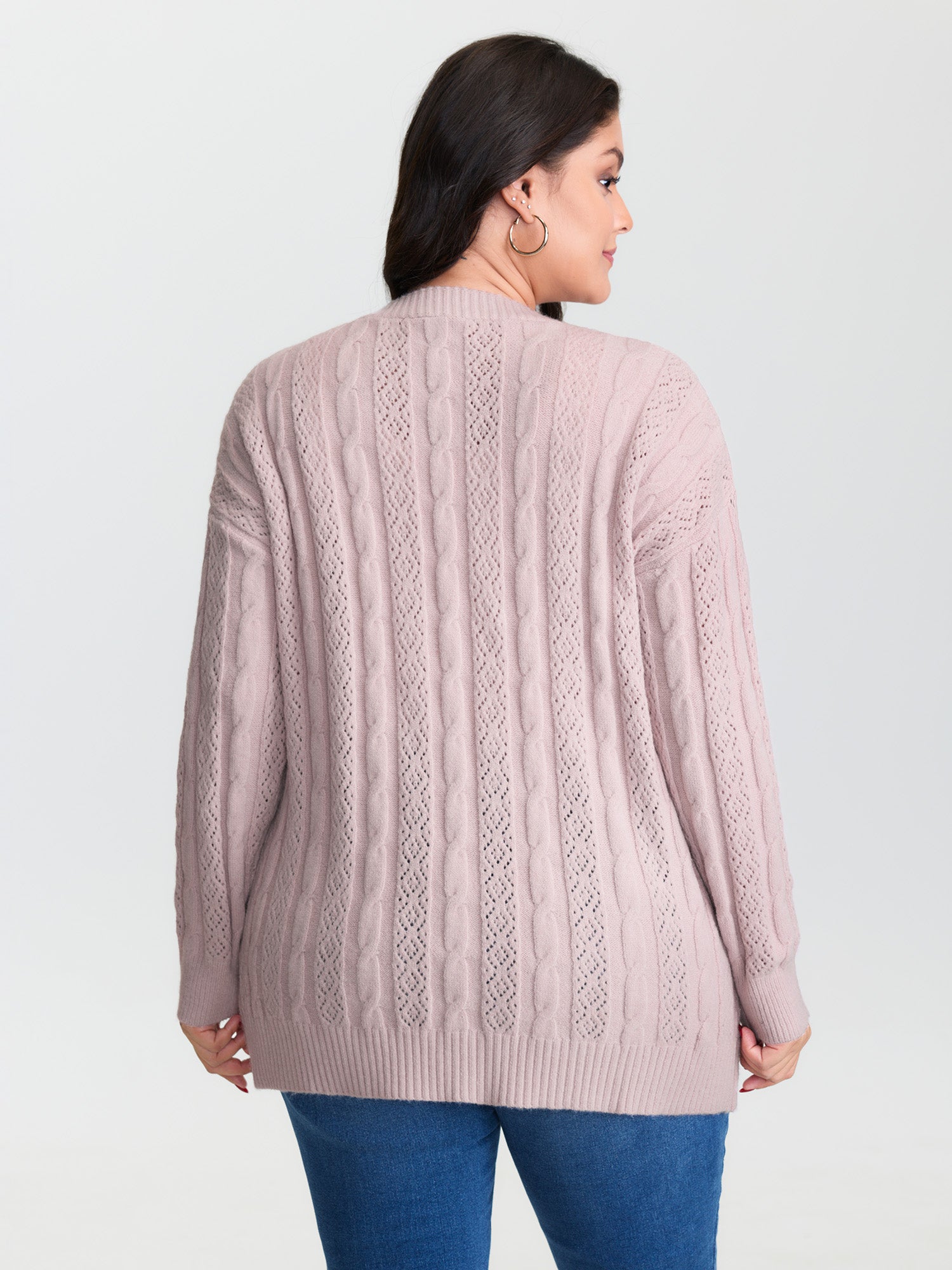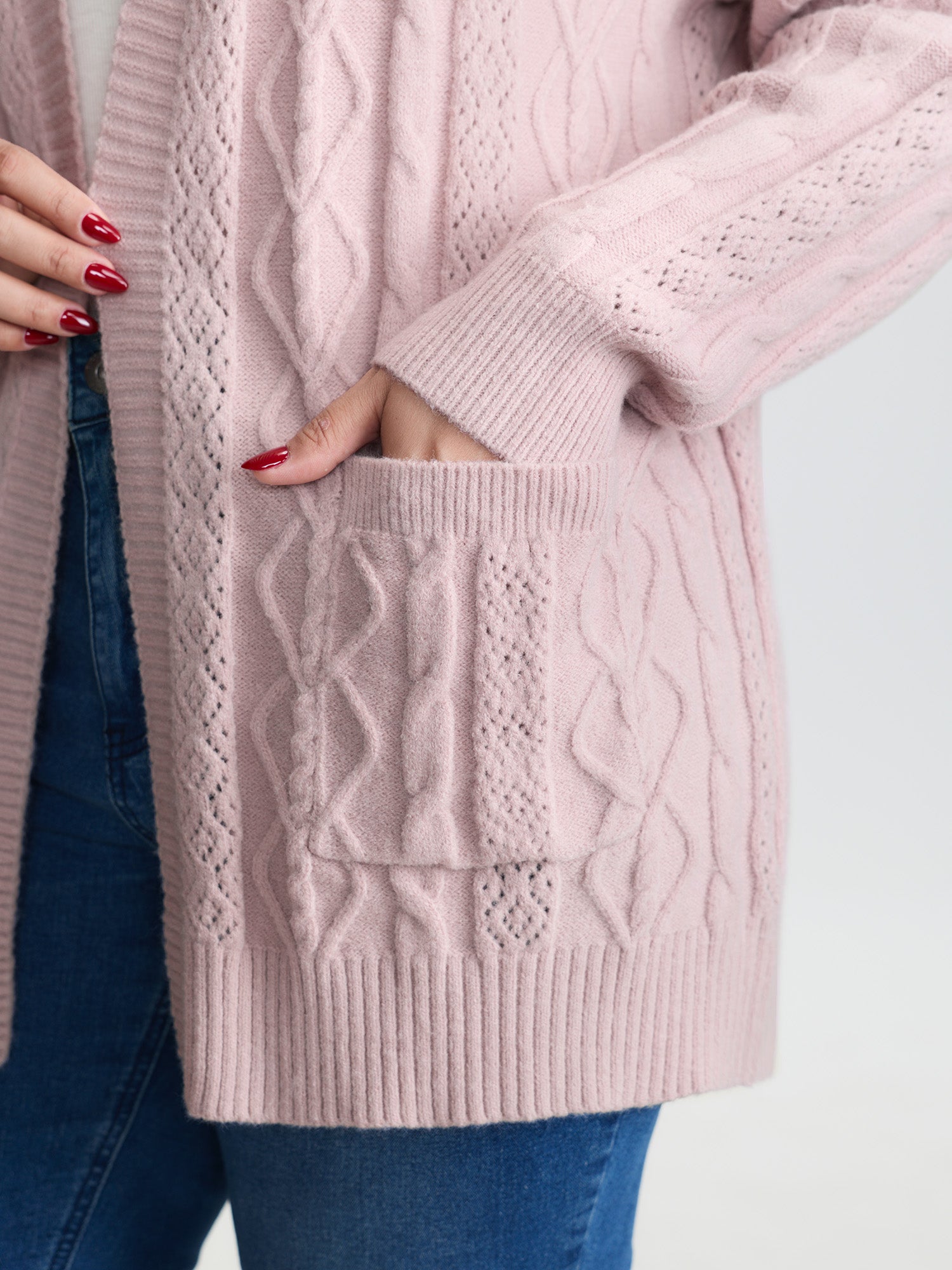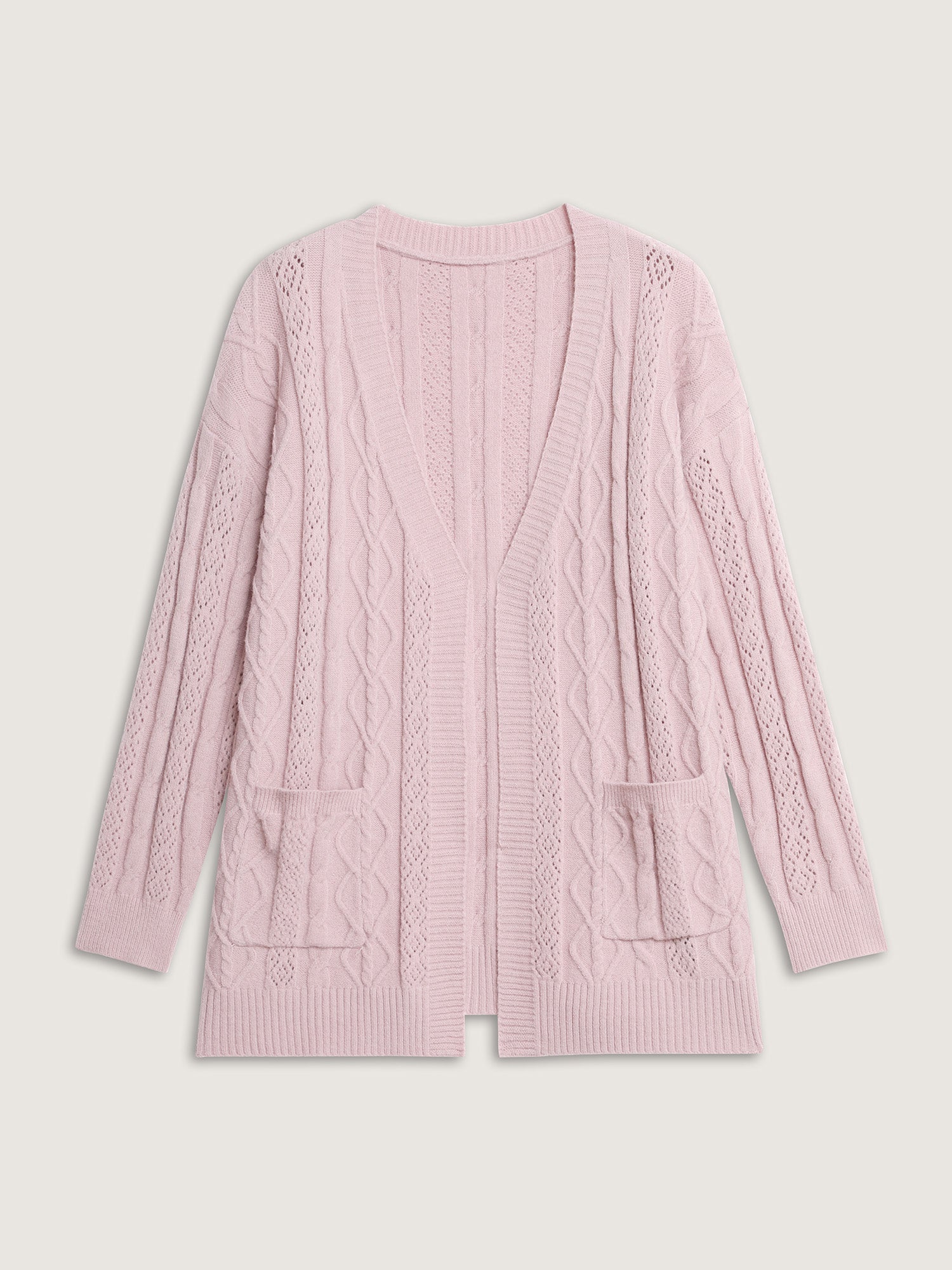 Shop Textured Cut-Out Open-Front Knit Cardigan now and redefine your style with confidence at BloomChic. Tailored for mid and plus-size women. This trendy Sweaters Cardigans Women, sizes 10-30. Color:Dirty Pink;Style:Leisure;Neckline:Deep V-neck;Sleeve Type:Drop shoulder sleeve;Prints:Non;Details:Texture, Cable Knit, Cut-Out;Pocket:Patch pocket;Belt:No-belt;Closure Type:Button