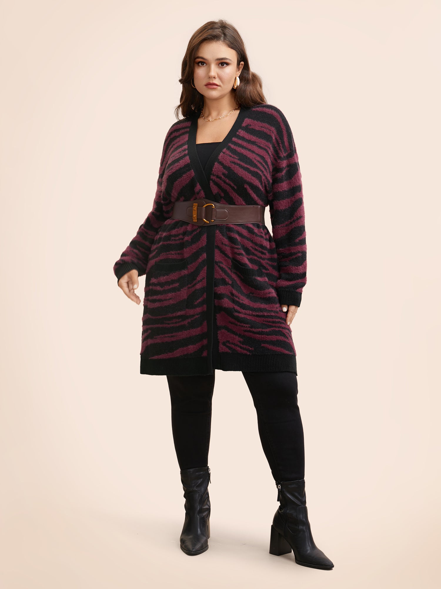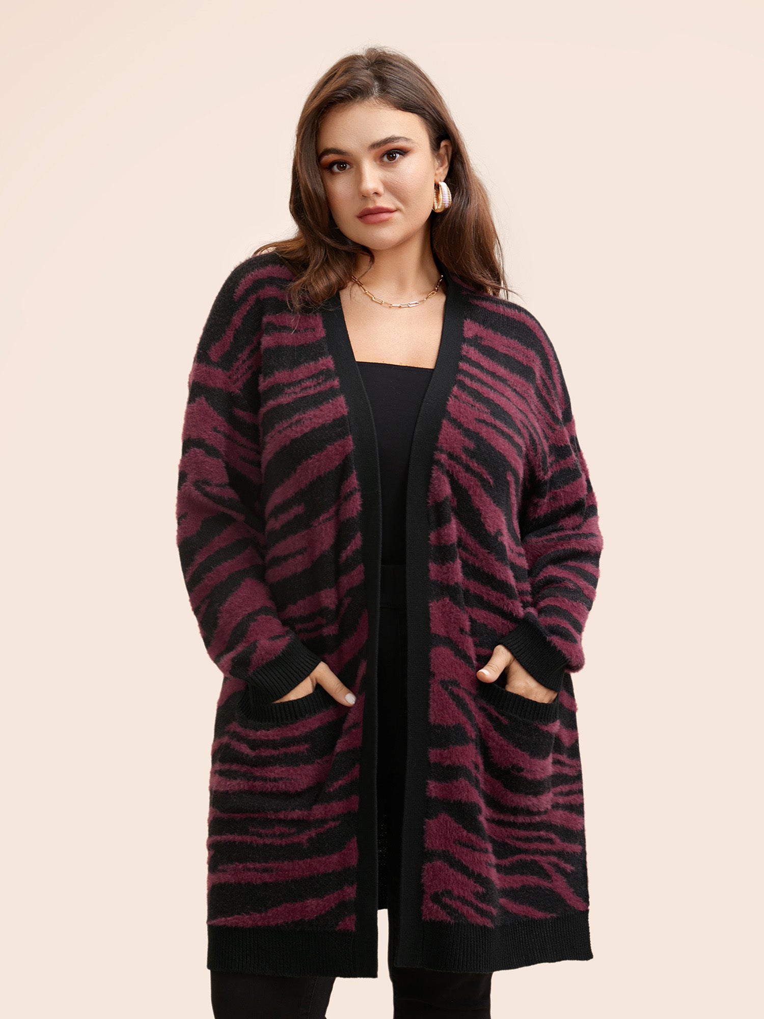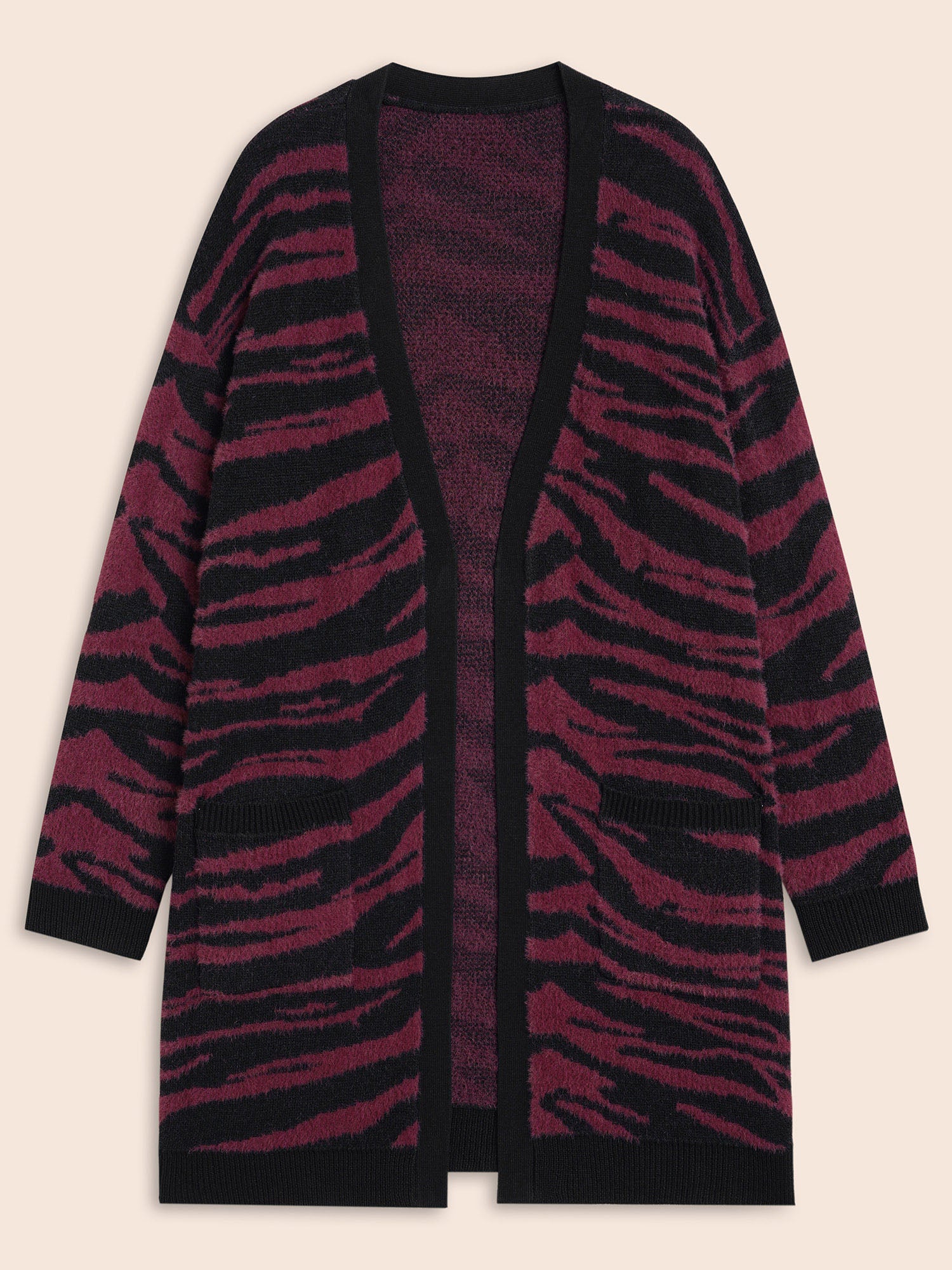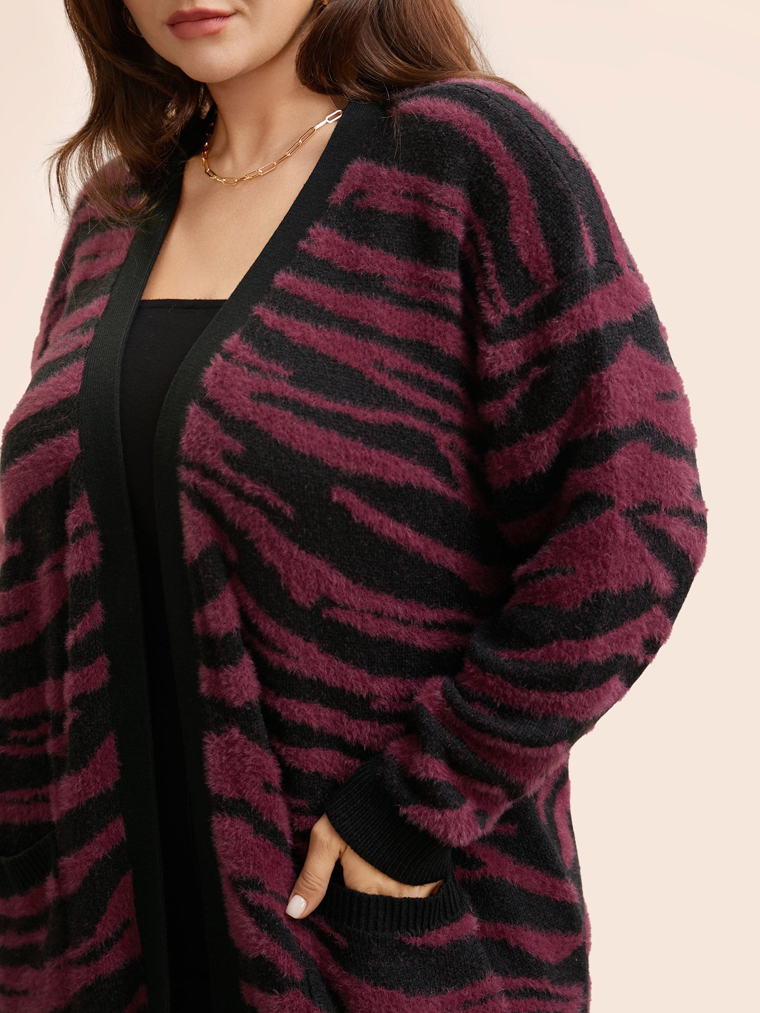 Shop Zebra Print Fluffy Patch Pocket Cardigan now and redefine your style with confidence at BloomChic. Tailored for mid and plus-size women. This trendy Sweaters Cardigans Women, sizes 10-30. Season:Winter;Color:Black;Style:Elegant;Neckline:Kimono collar;Sleeve Type:Drop shoulder sleeve;Prints:Animal print;Details:Contrast, Slit, Texture;Pocket:Patch pocket;Belt:No-belt;Closure Type:Open front without closure
