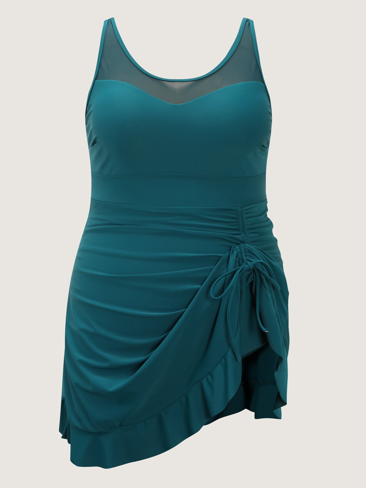 Shop Channel Drawstring Ruffled Swim Dress now and redefine your style with confidence at BloomChic. Tailored for mid and plus-size women. This trendy Swimwear Women, sizes 10-30. Color:Cyan;Style:Resort;Cup Type:Removable cups;Functional Fabric:Chlorine Resistant;Neckline:U-neck;Sleeve Type:Sleeveless;Prints:Non;Details:Drawstring, Ruffles, See through;Pocket:No-pocket;Belt:No-belt;Chest pad:Removable Padding;Lining:Lining;Closure Type:Non;Structural function:Adaptive-Fit;One-piece or split swim dresses:Built-in bottoms;Swimsuit types:Built-in Bikini Dress