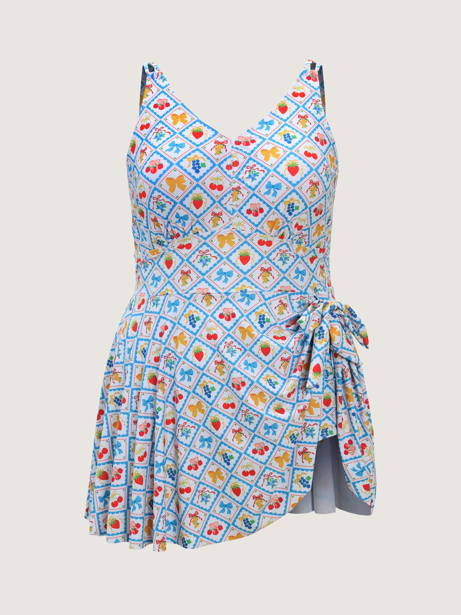Shop Fun Fruit Print Knotted Hem Swim Dress now and redefine your style with confidence at BloomChic. Tailored for mid and plus-size women. This trendy Swimwear Women, sizes 10-30. Color:Multicolor;Style_2:Resort;Cup Type:Removable cups;Neckline:V-neck;Sleeve Type:Sleeveless;Prints:Fruit and vegetable print;Details:Tie knot;Pocket:No-pocket;Belt:No-belt;Chest pad:Removable Padding;Lining:Lining;Closure Type:Non;Structural function:Cinched & Flared,Full Coverage,Adaptive-Fit;One-piece or split swim dresses:Built-in bottoms;Swimsuit types:Built-in Bikini Bottoms Dress;Functional Fabric:Chlorine Resistant