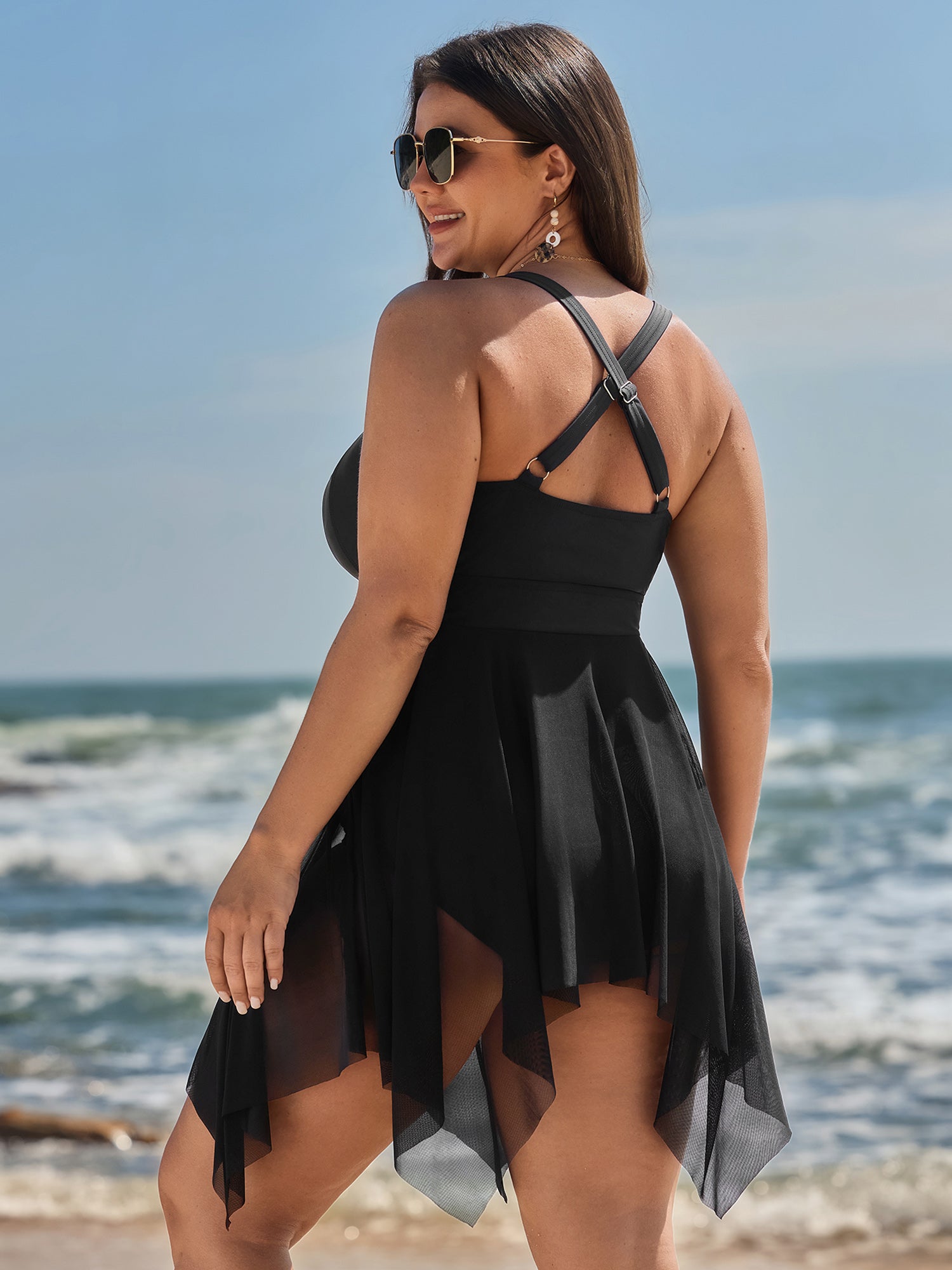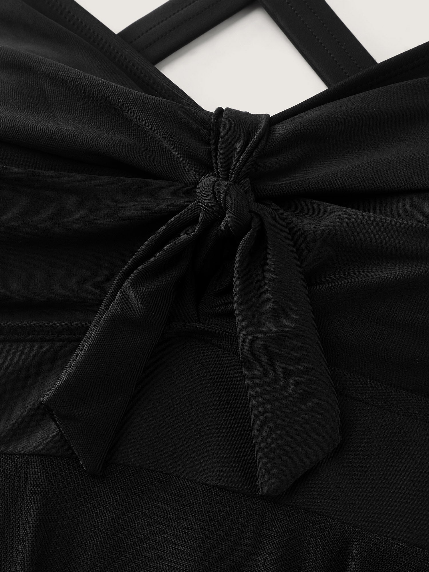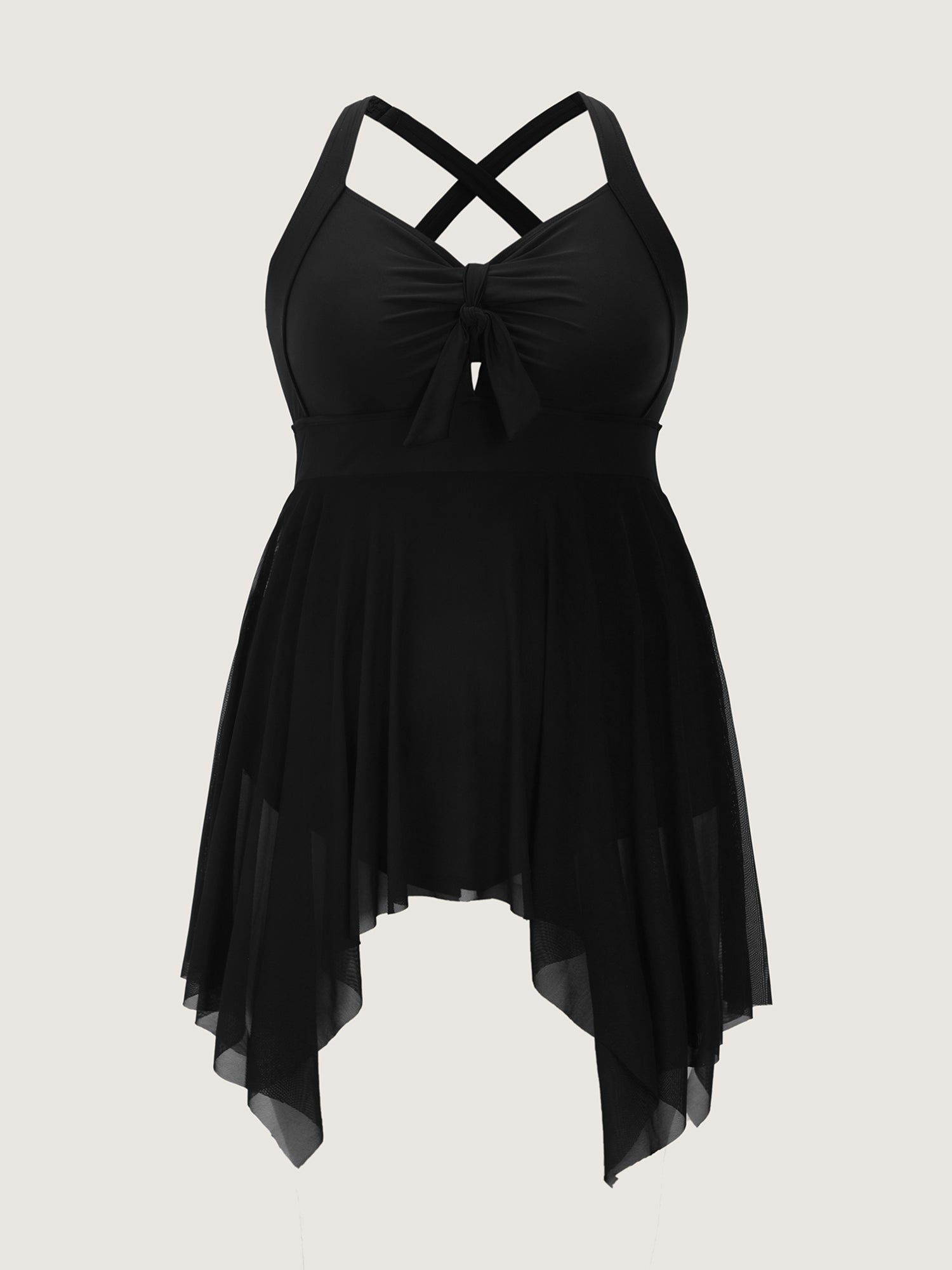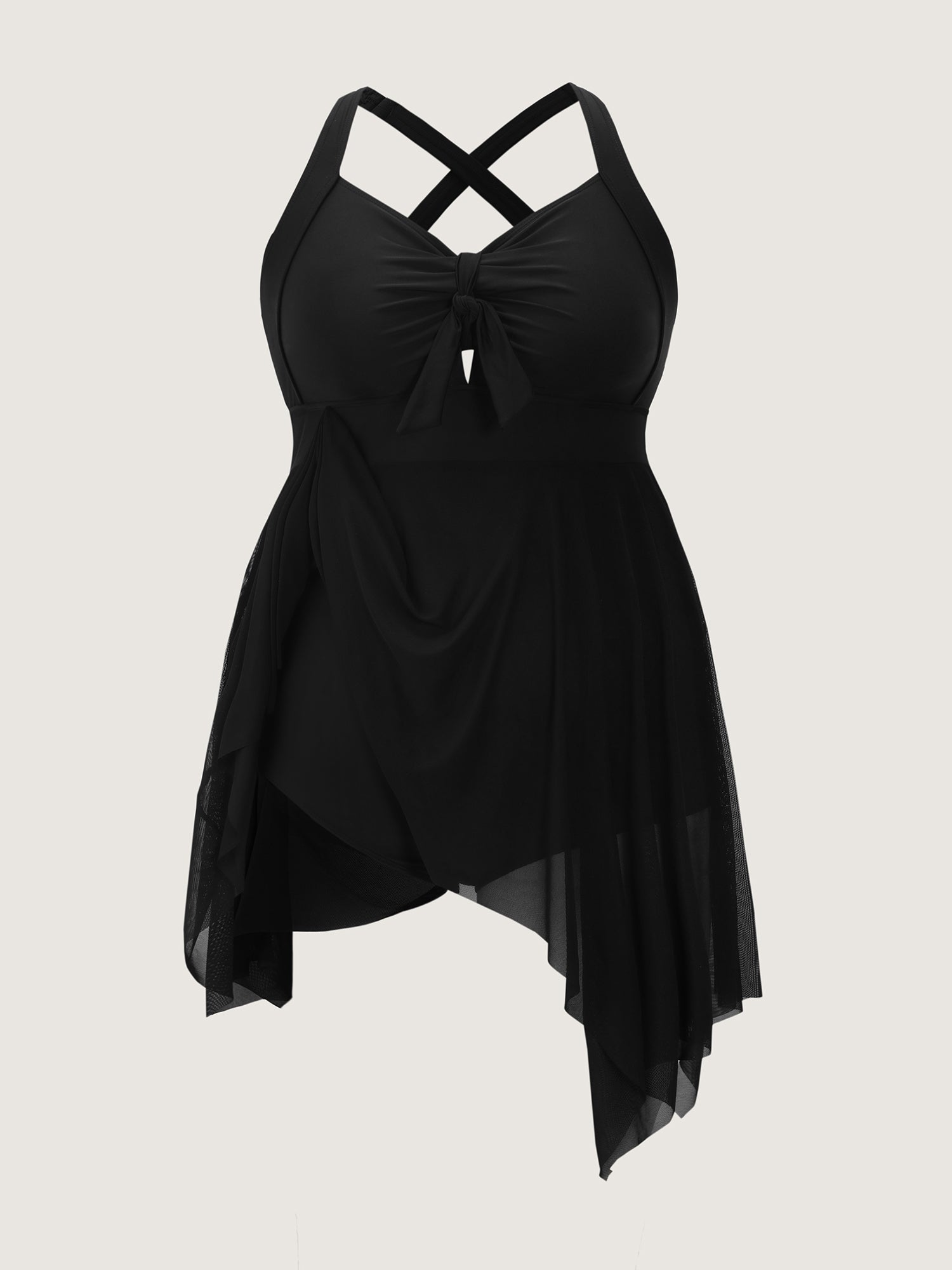 Shop Mesh Knotted Front Adjustable Swim Dress now and redefine your style with confidence at BloomChic. Tailored for mid and plus-size women. This trendy Swimwear Women, sizes 10-30. Color:Black;Style_2:Resort;Cup Type:Removable cups;Coverage:Full;Neckline:Heart neckline;Sleeve Type:Sleeveless;Prints:Non;Details:Asymmetrical, Tie knot;Pocket:No-pocket;Belt:No-belt;Chest pad:Removable Padding;Lining:Lining;Closure Type:Non;Structural function:Cinched & Flared,Full Coverage,Adaptive-Fit;One-piece or split swim dresses:Built-in bottoms;Swimsuit types:Built-in Bikini Bottoms Dress;Functional Fabric:Chlorine Resistant