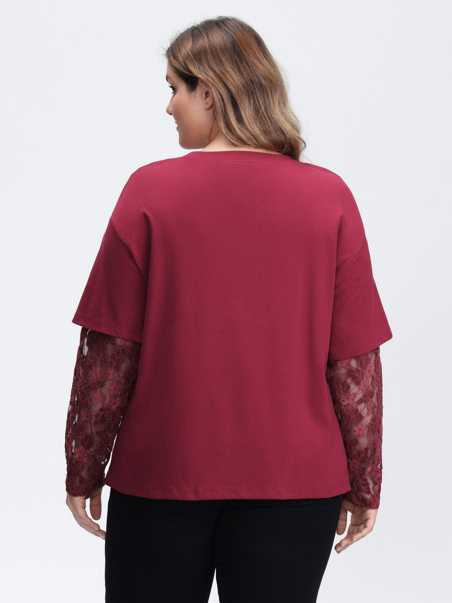 Shop 2-In-1 Layered Sheer Lace Sleeve T-Shirt now and redefine your style with confidence at BloomChic. Tailored for mid and plus-size women. This trendy Tops Women, sizes 10-30. Color:Scarlet;Prints:Non;Neckline:Round Neck;Sleeve Type:Drop shoulder sleeve;Pocket:No-pocket