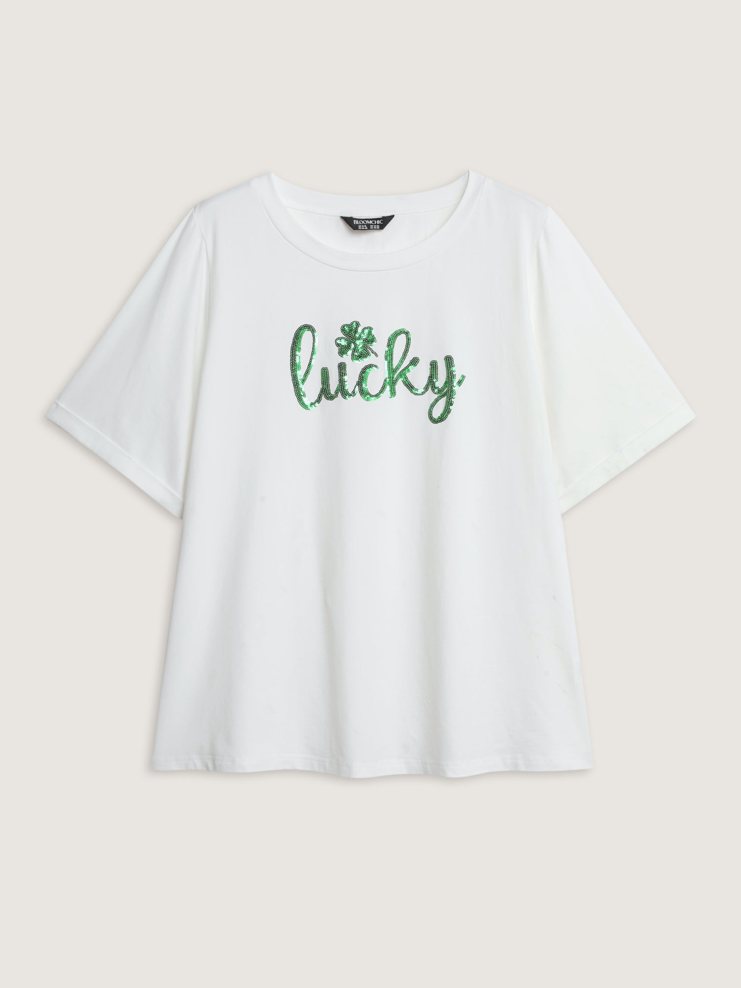 Shop Cotton Embroidered Lucky Pattern T-Shirt now and redefine your style with confidence at BloomChic. Tailored for mid and plus-size women. This trendy Tops Women, sizes 10-30. Color:Original White;Style:Playful;Pattern Type:Positive slogan;Prints:Non;Neckline:Round Neck;Sleeve Type:Regular Sleeve;Details:Embroidered;Pocket:No-pocket