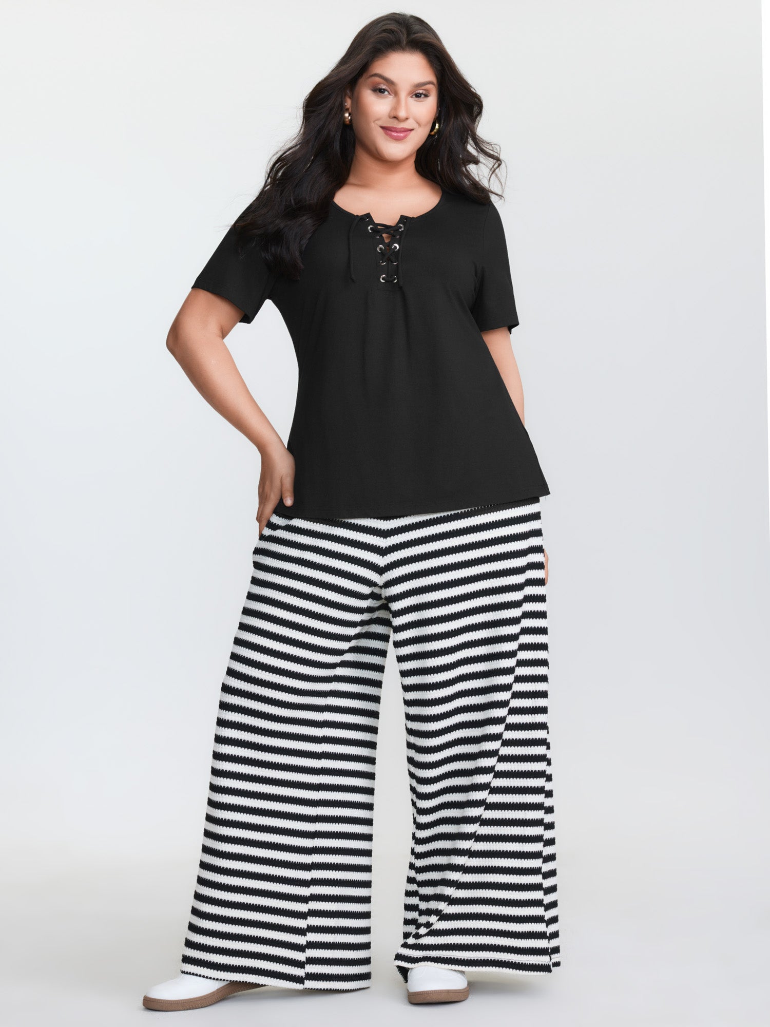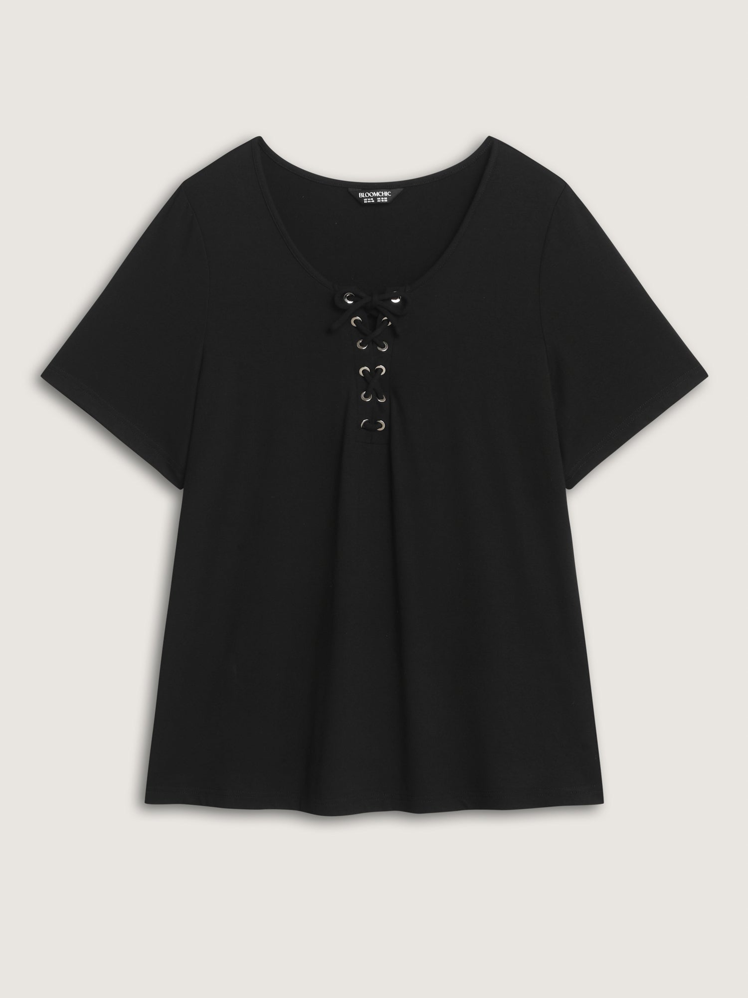 Shop Cross Tie Neckline Plain T-Shirt now and redefine your style with confidence at BloomChic. Tailored for mid and plus-size women. This trendy Tops Women, sizes 10-30. Color:Black;Style:Leisure;Prints:Non;Neckline:Flat collar with V-notch;Sleeve Type:Regular Sleeve;Details:Drawstring, Knotted, Eyelet;Pocket:No-pocket