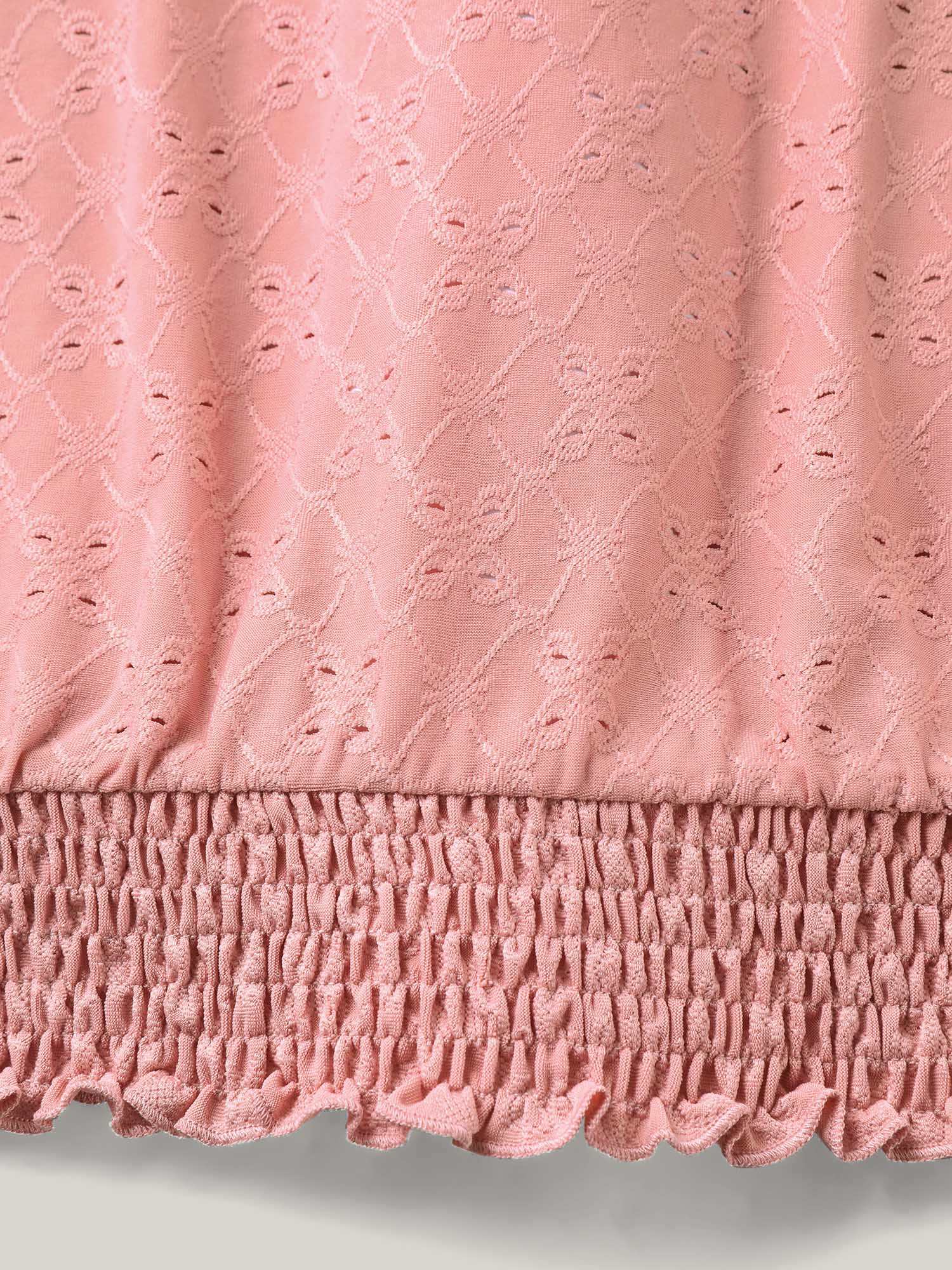 Eyelet Trim Flared Sleeve Shirred Hem Top