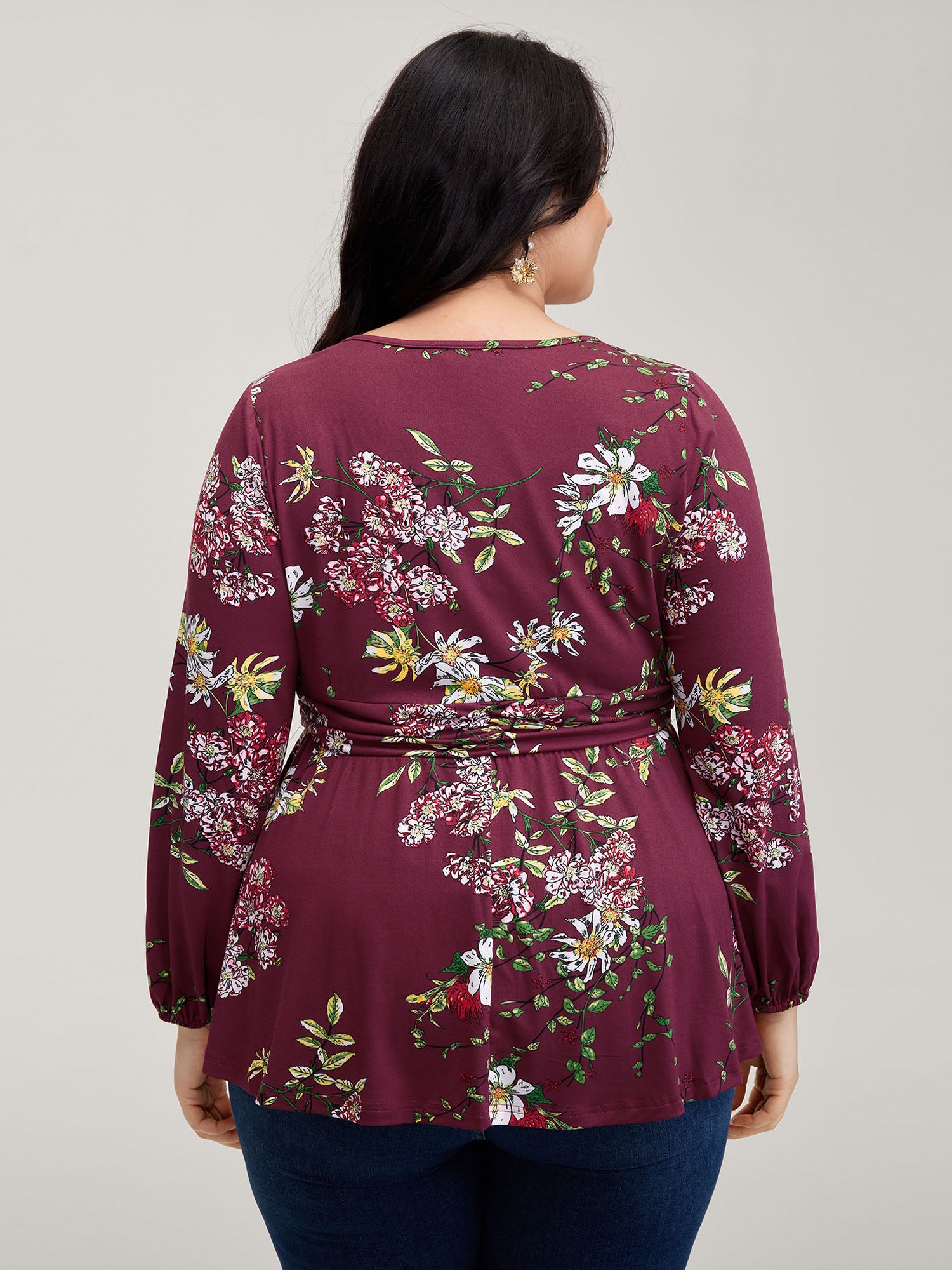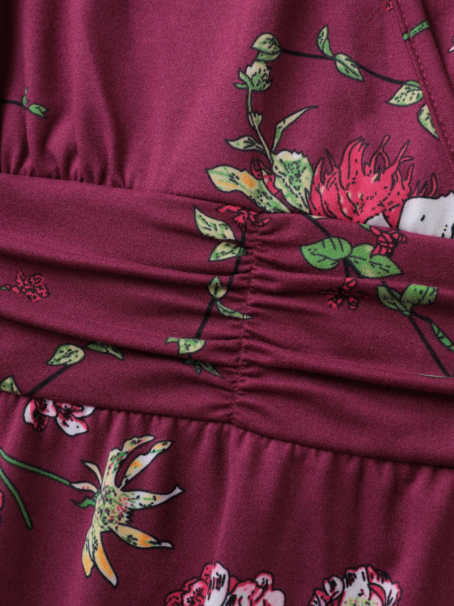 Floral Pleated Waist Stretchy Knit Top