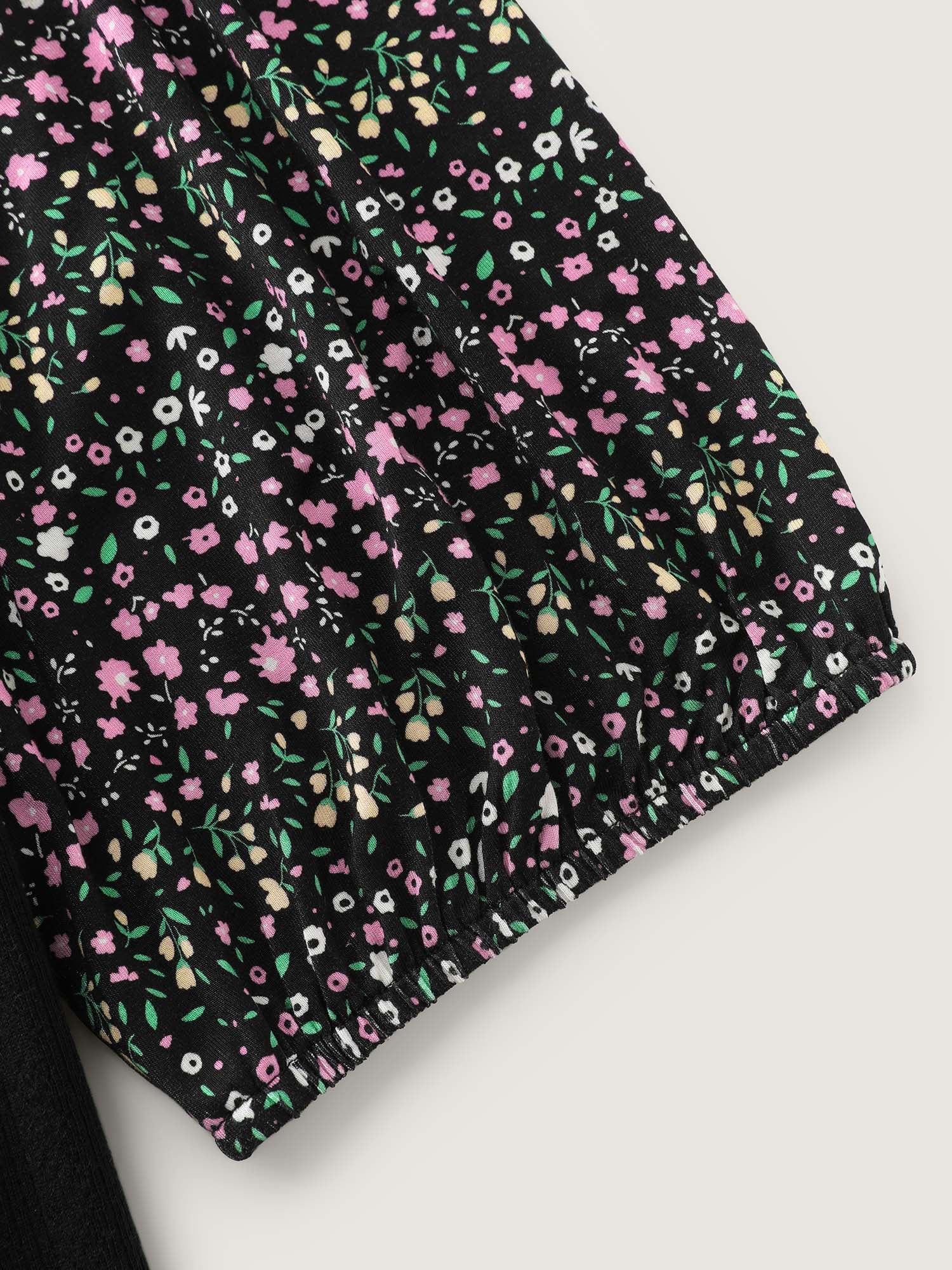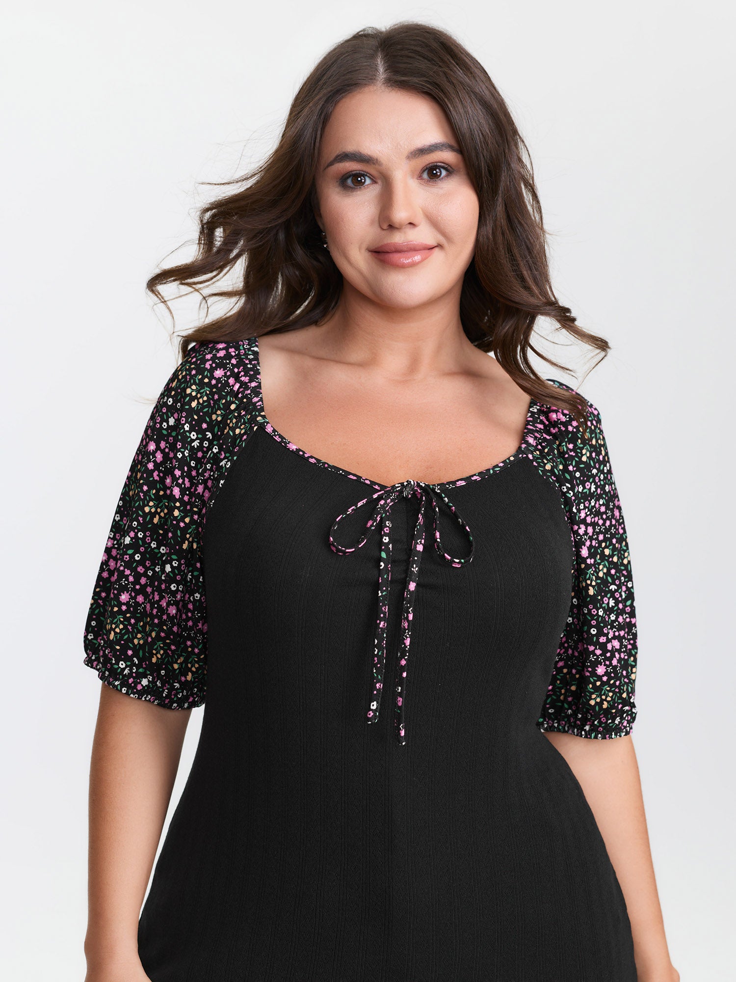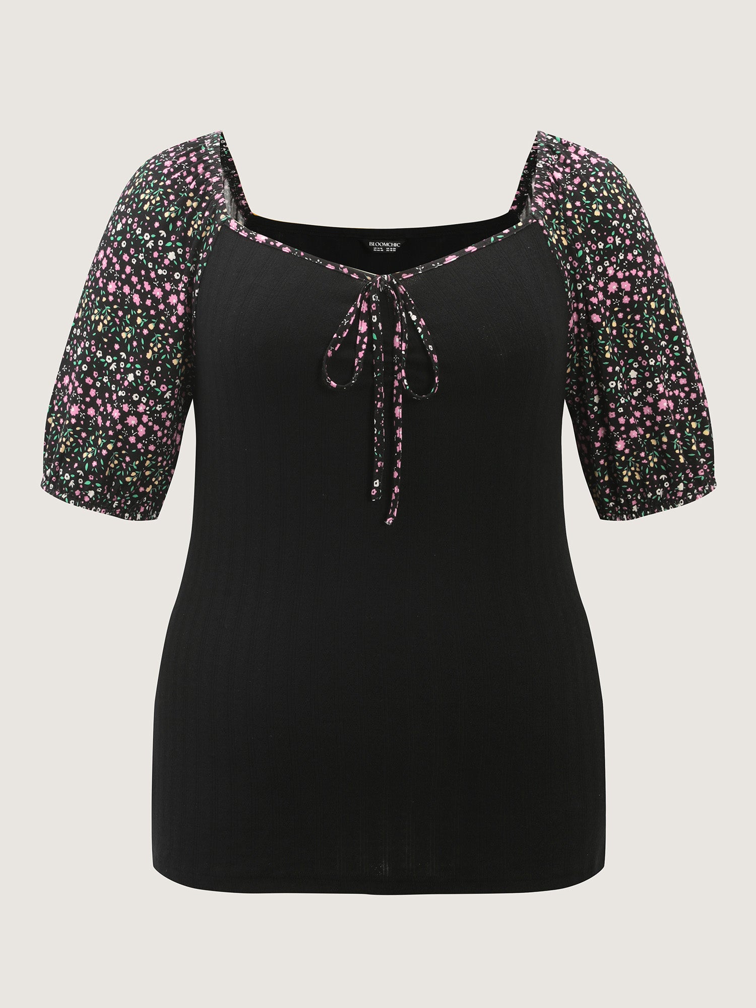 Shop Floral Print Color Contrast T-Shirt now and redefine your style with confidence at BloomChic. Tailored for mid and plus-size women. This trendy Tops Women, sizes 10-30. Color:Black;Style:Playful;Prints:Non;Neckline:Heart neckline;Sleeve Type:Lantern Sleeve;Details:Tie knot, Contrast;Pocket:No-pocket