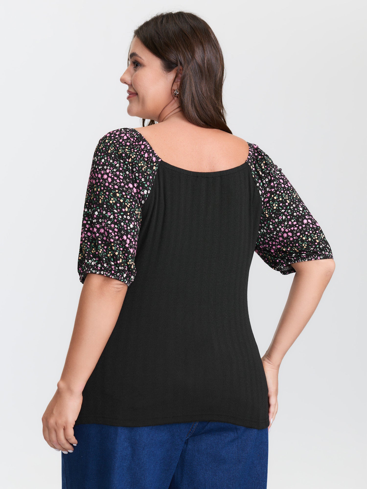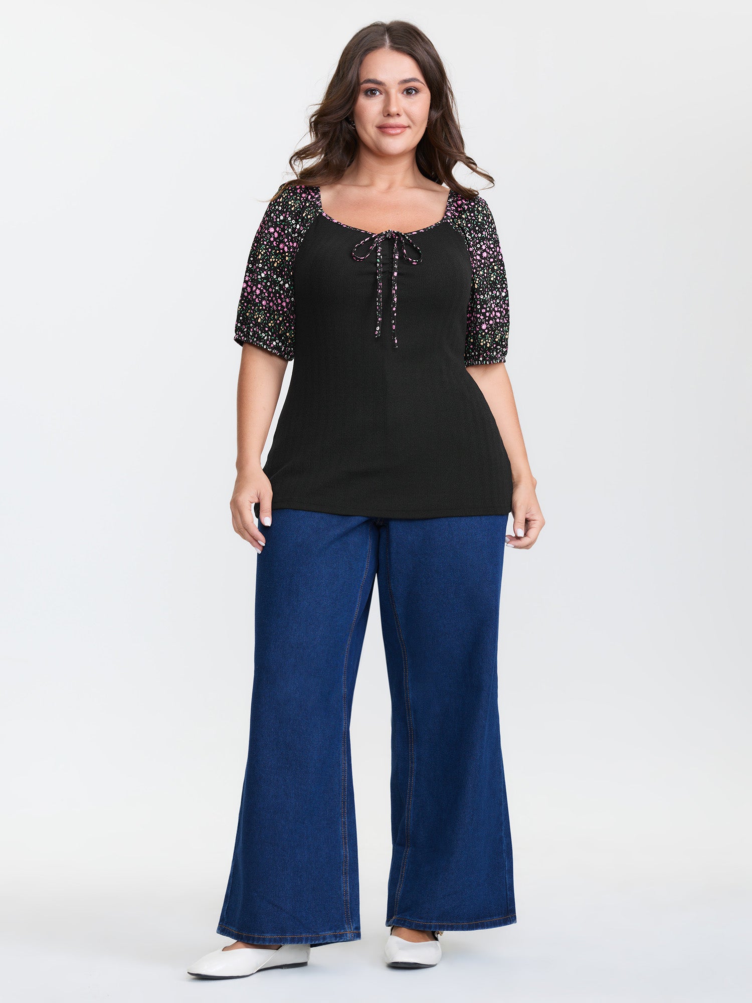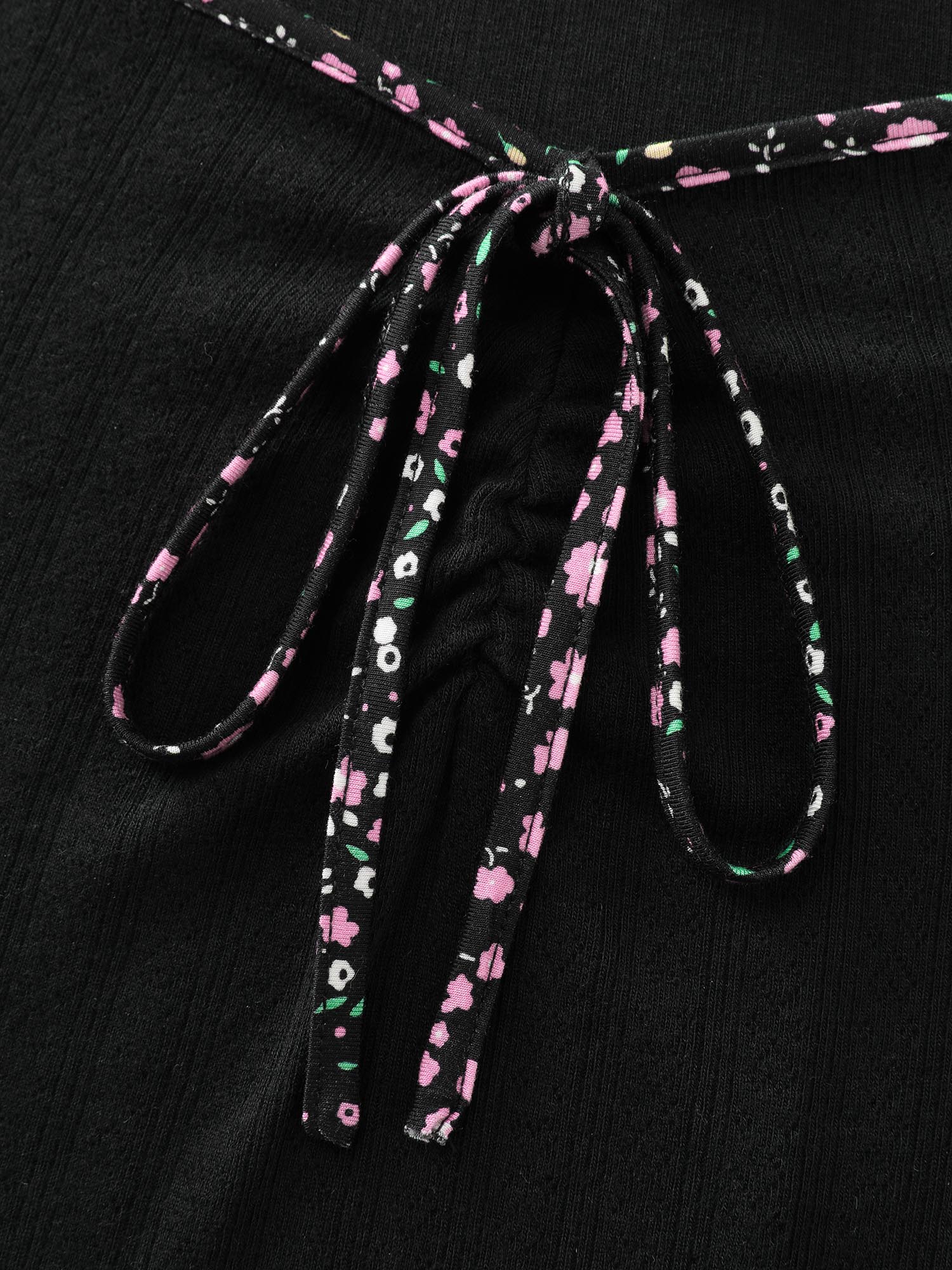 Shop Floral Print Color Contrast T-Shirt now and redefine your style with confidence at BloomChic. Tailored for mid and plus-size women. This trendy Tops Women, sizes 10-30. Color:Black;Style:Playful;Prints:Non;Neckline:Heart neckline;Sleeve Type:Lantern Sleeve;Details:Tie knot, Contrast;Pocket:No-pocket