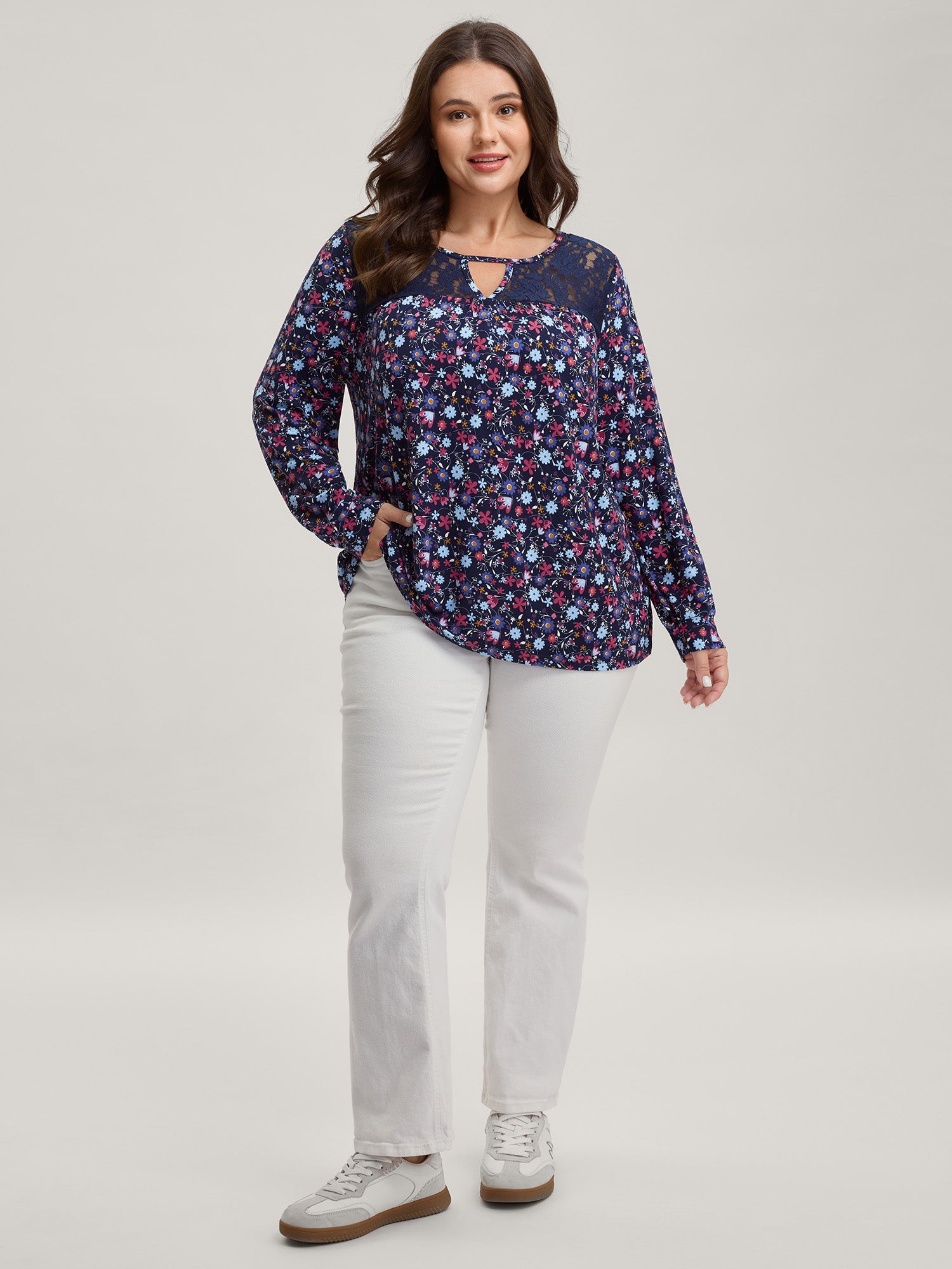 Shop Floral Print Contrast Flowy Knit Top now and redefine your style with confidence at BloomChic. Tailored for mid and plus-size women. This trendy Tops Women, sizes 10-30. Color:Midnight;Prints:Non;Neckline:Notched collar;Sleeve Type:Regular Sleeve;Details:Cut-Out, See through, Contrast;Pocket:No-pocket