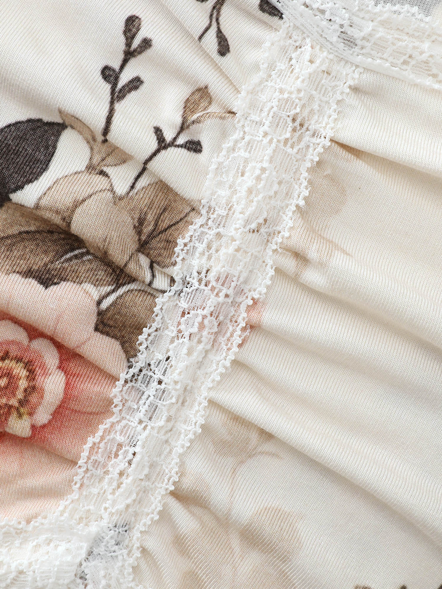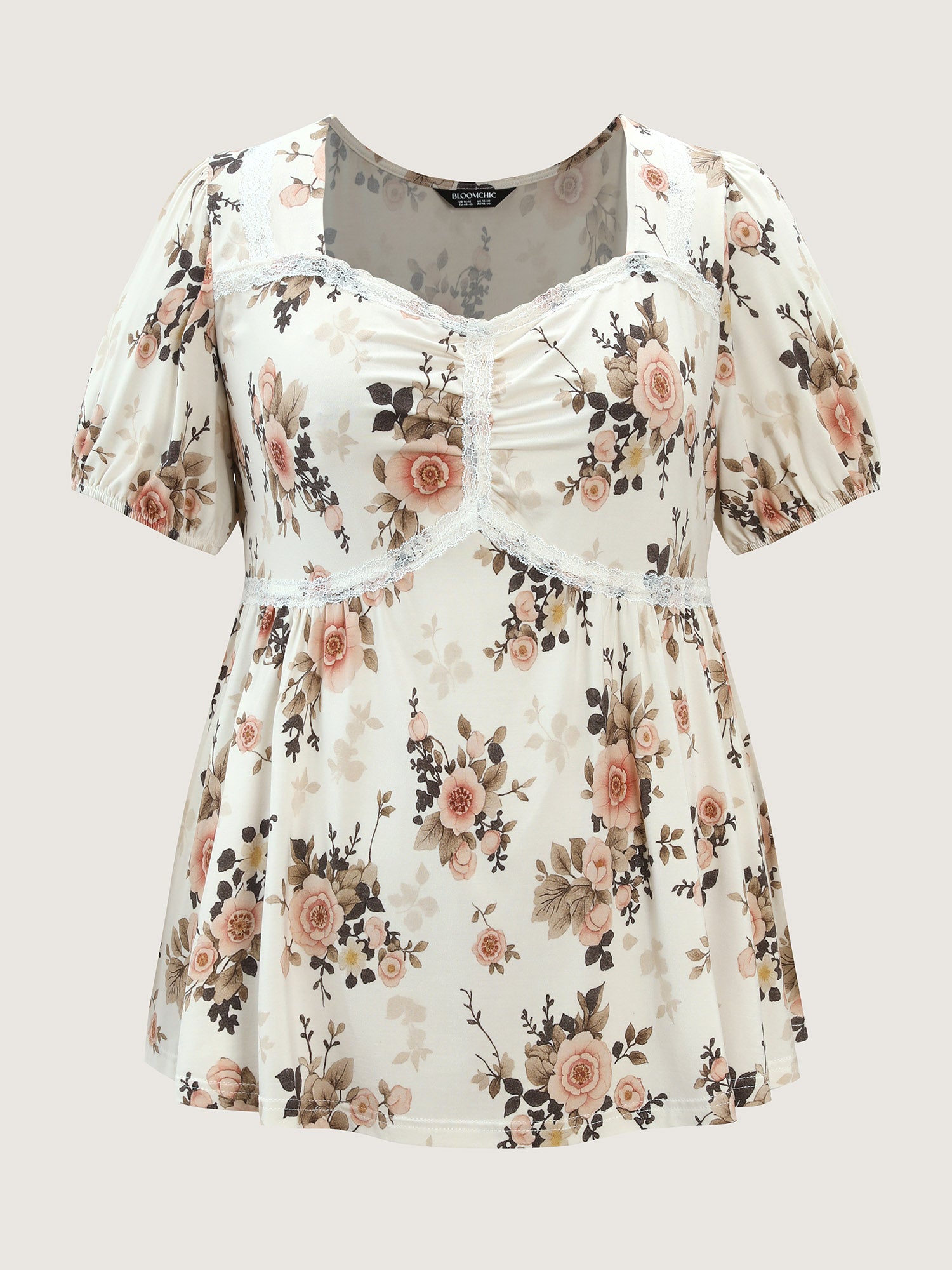 Shop Floral Print Lace Trim Knit Top now and redefine your style with confidence at BloomChic. Tailored for mid and plus-size women. This trendy Tops Women, sizes 10-30. Color:lvory;Style:Romantic;Prints:Floral;Neckline:Heart neckline;Sleeve Type:Puff Sleeve;Details:Patchwork, Contrast, Gathered, Woven ribbon&lace trim;Pocket:No-pocket