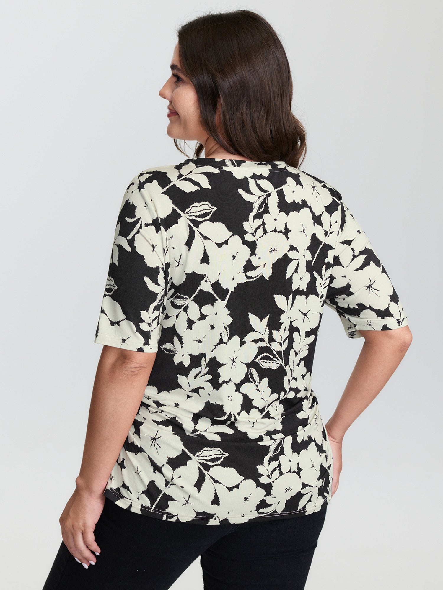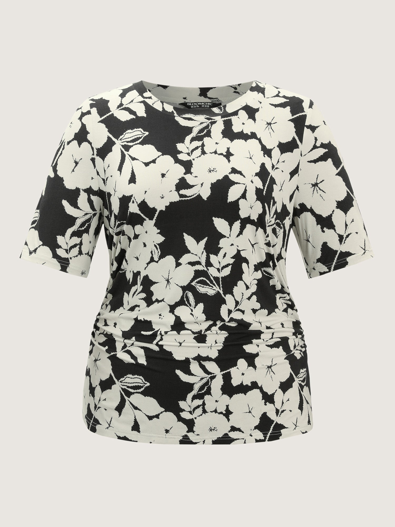 Shop Supersoft Floral Print Ruched T-Shirt now and redefine your style with confidence at BloomChic. Tailored for mid and plus-size women. This trendy Tops Women, sizes 10-30. Color:Black Flower;Style:Leisure;Pattern Type:Natural Flowers;Prints:Floral;Neckline:Round Neck;Sleeve Type:Regular Sleeve;Details:Gathered;Pocket:No-pocket