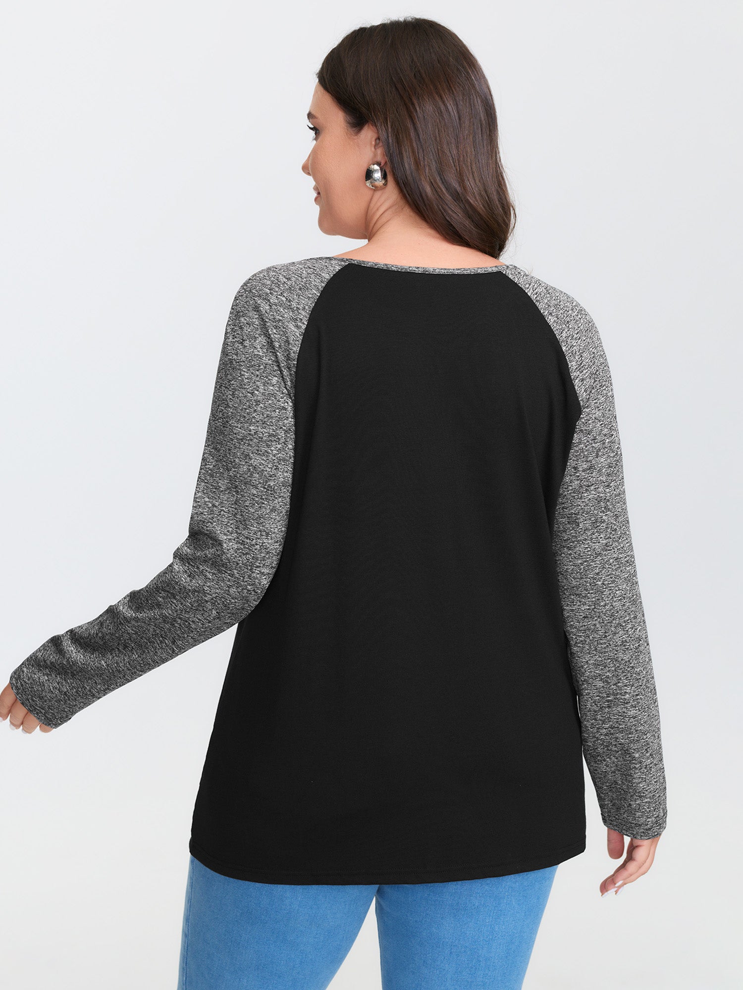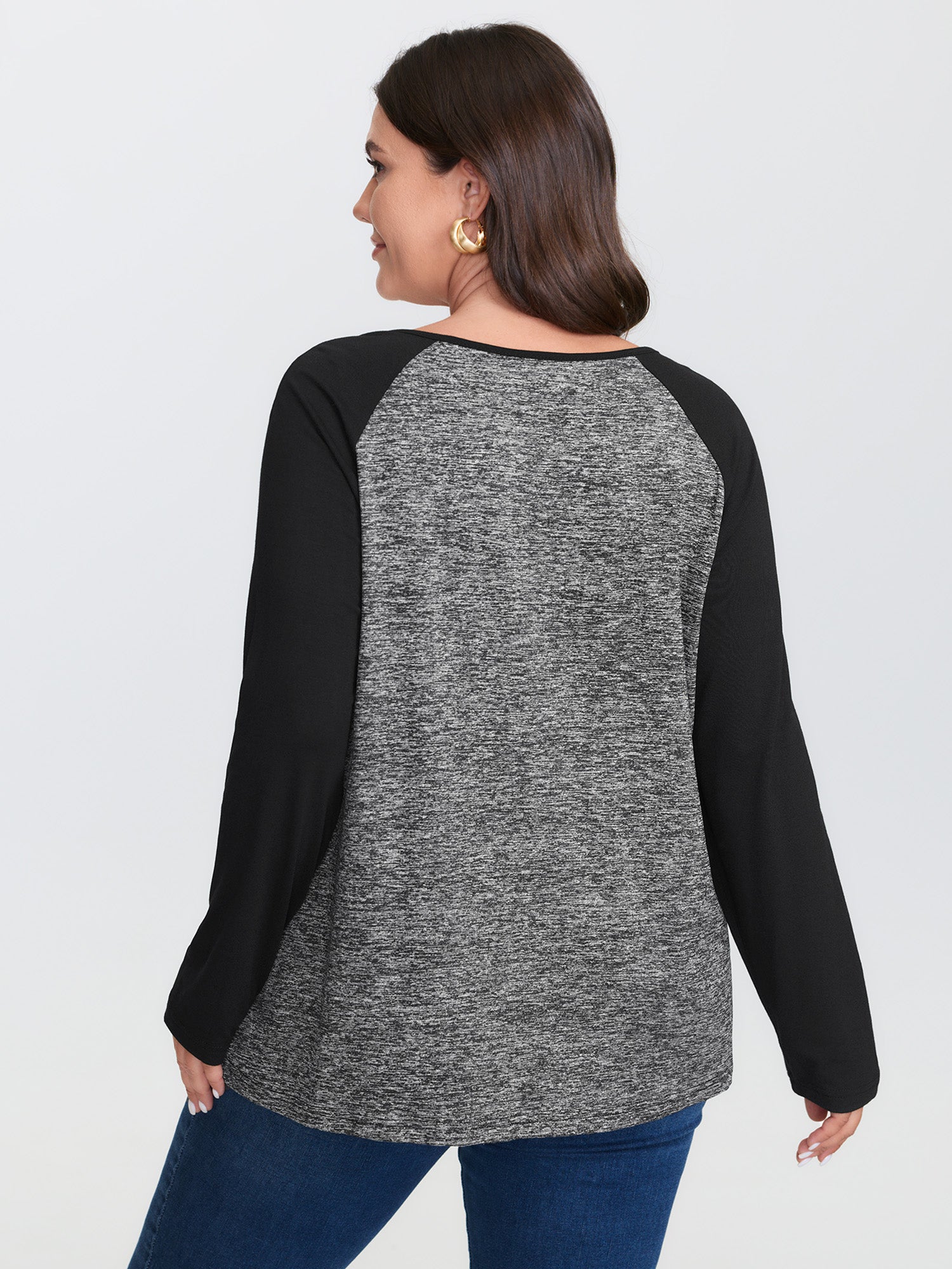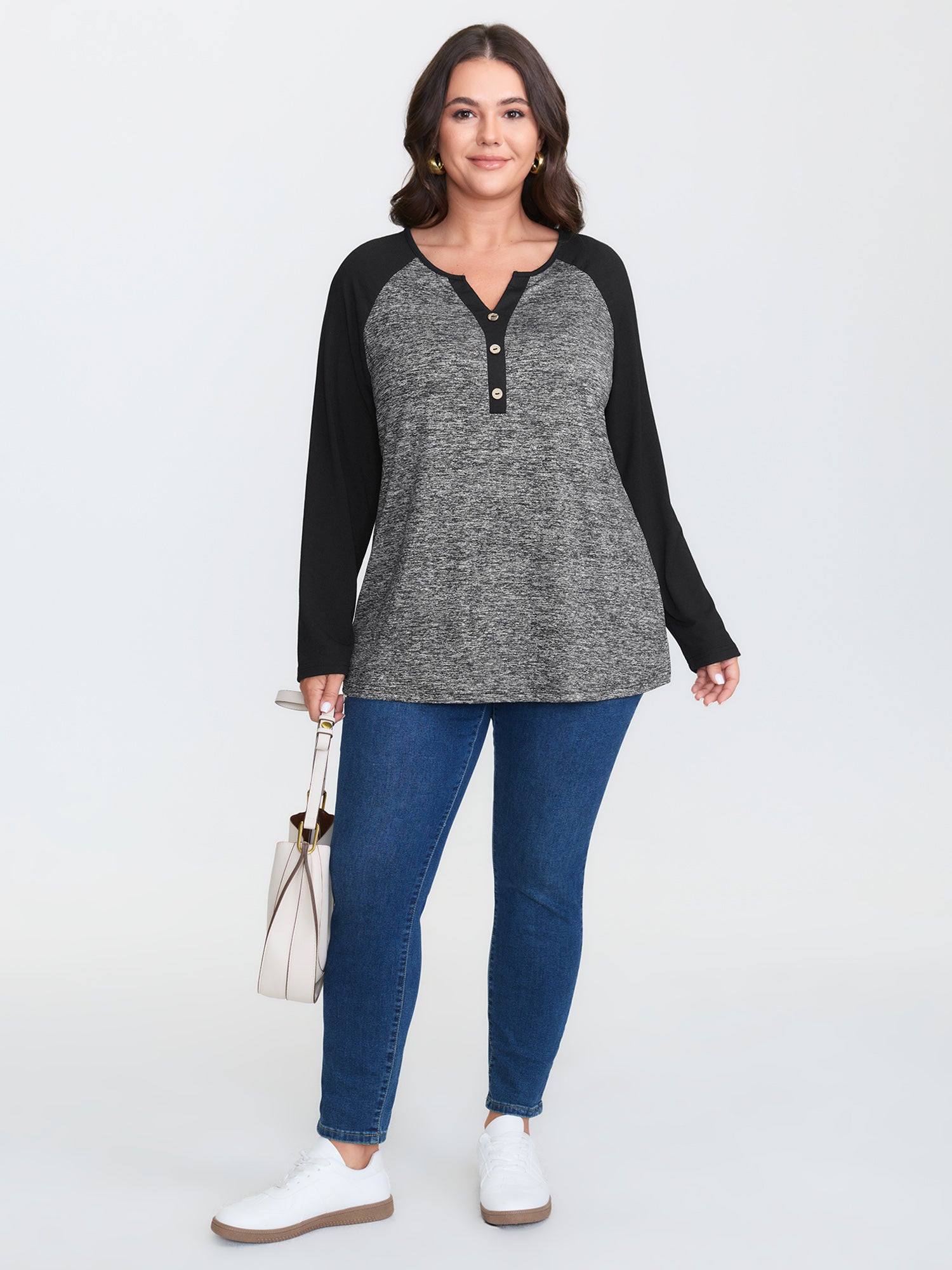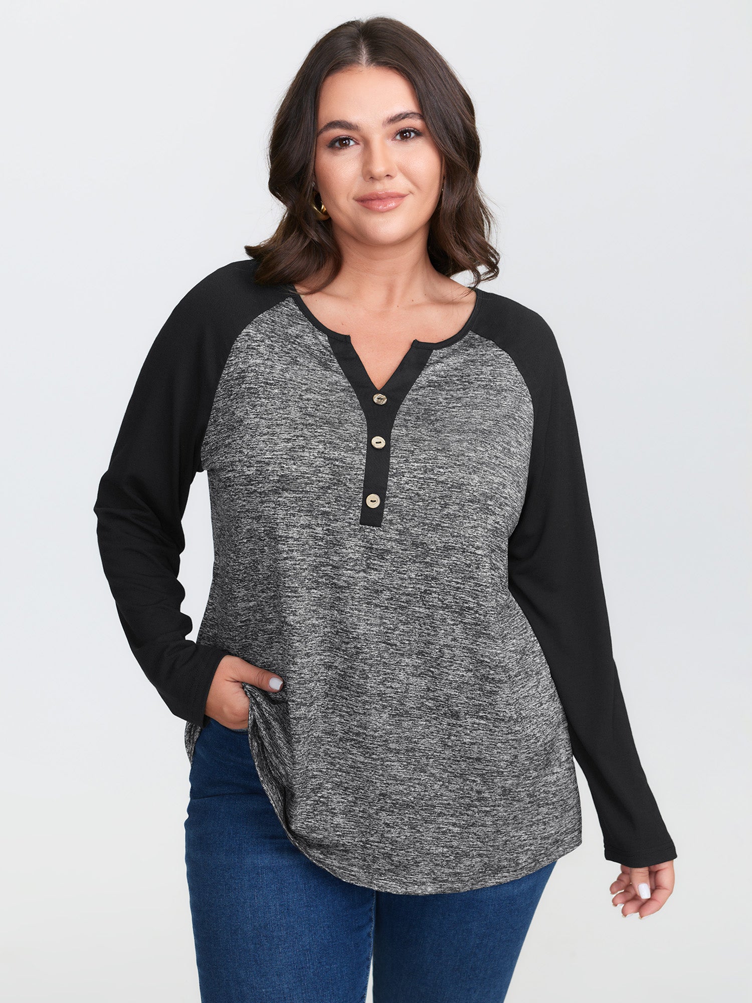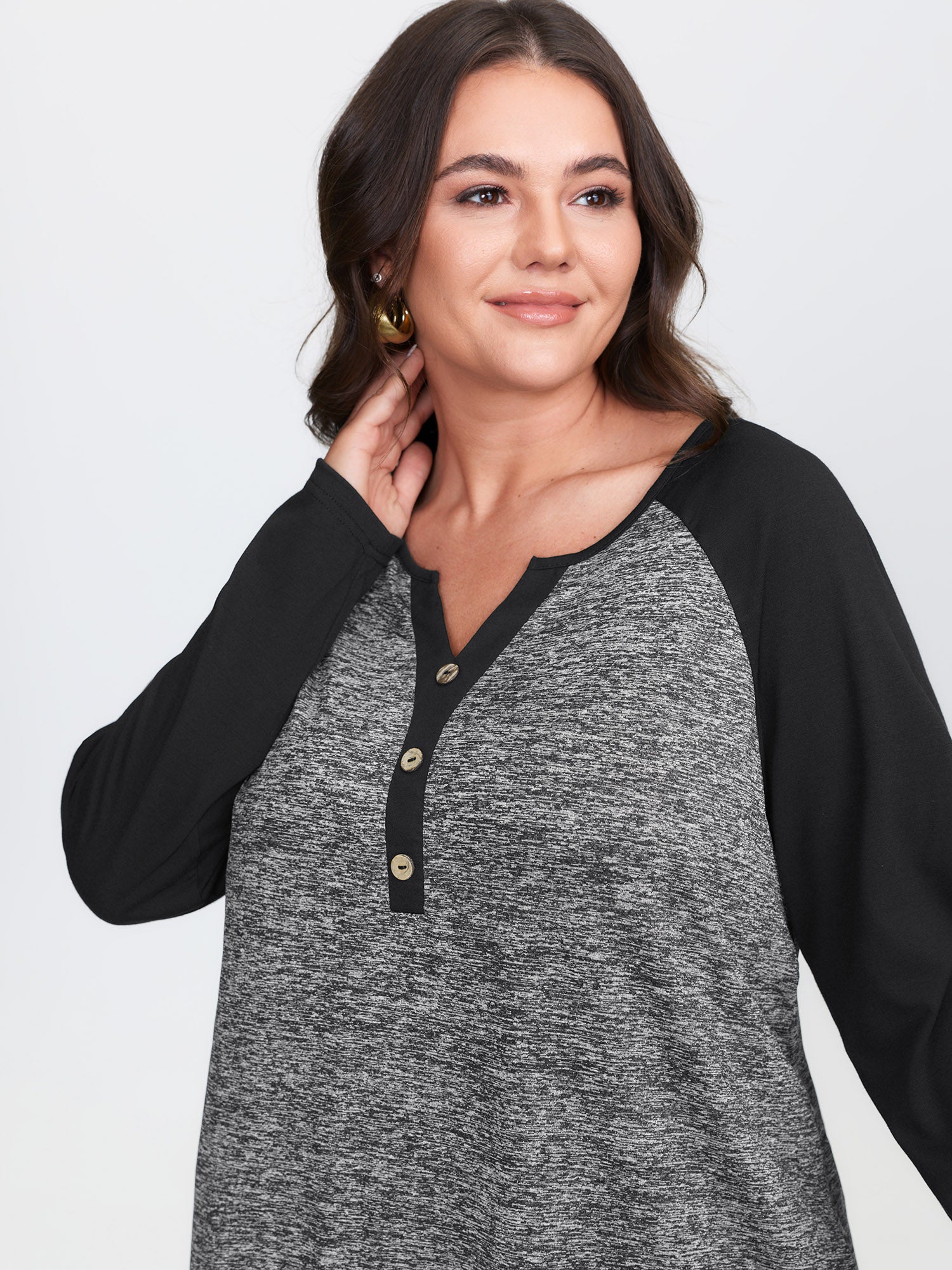 Shop Heather Patchwork Button Detail Stretchy T-Shirt now and redefine your style with confidence at BloomChic. Tailored for mid and plus-size women. This trendy Tops Women, sizes 10-30. Color:Black, Burgundy, Dark Gray, Dark Blue, Dark Brown, Cyan;Style:Leisure;Pattern Type:Plain;Prints:Non;Neckline:Flat collar with V-notch;Sleeve Type:Raglan sleeve;Details:Button, Patchwork, Contrast;Pocket:No-pocket