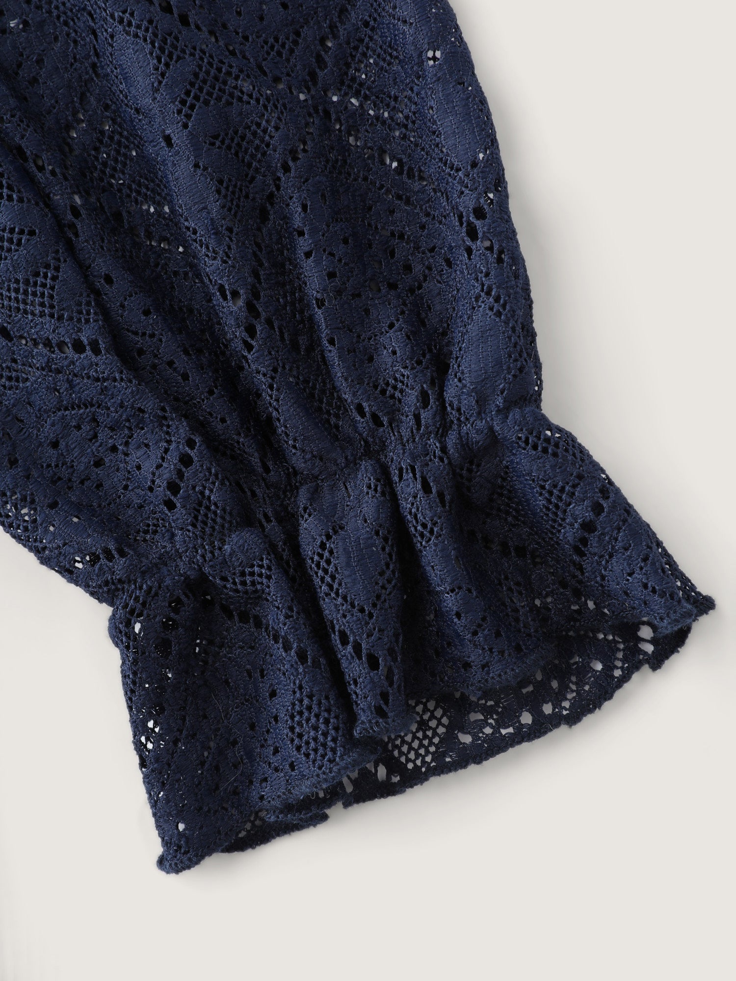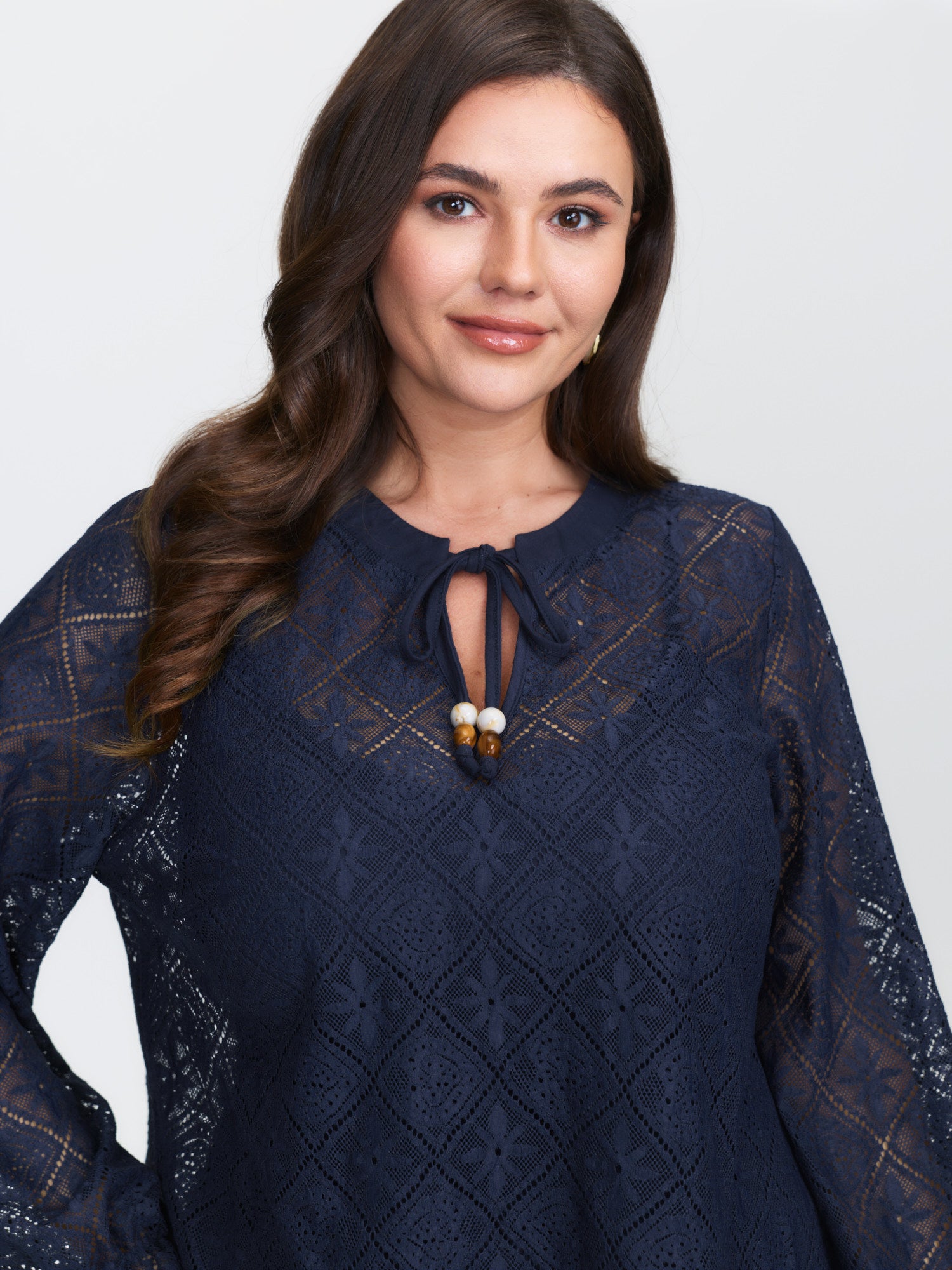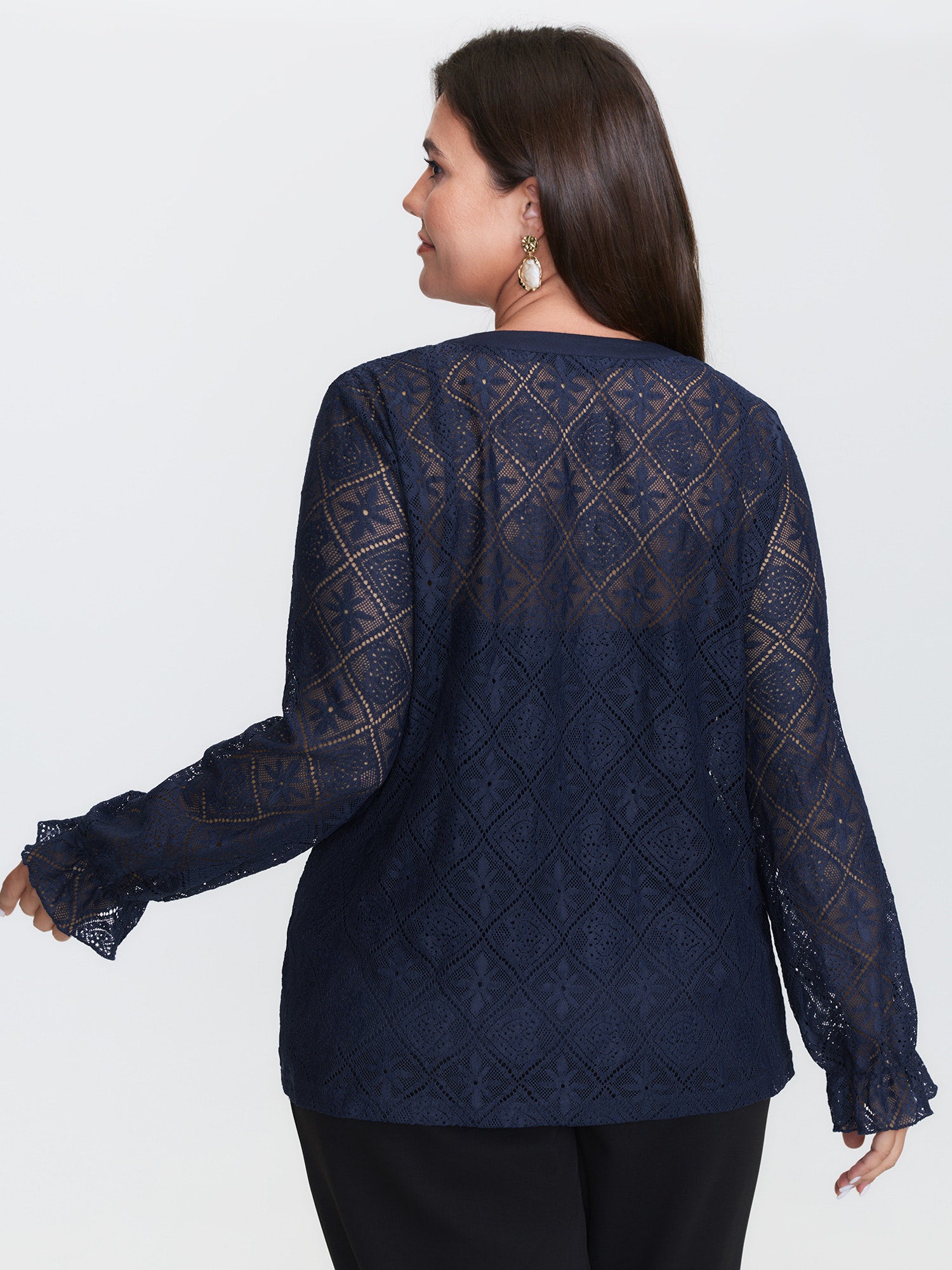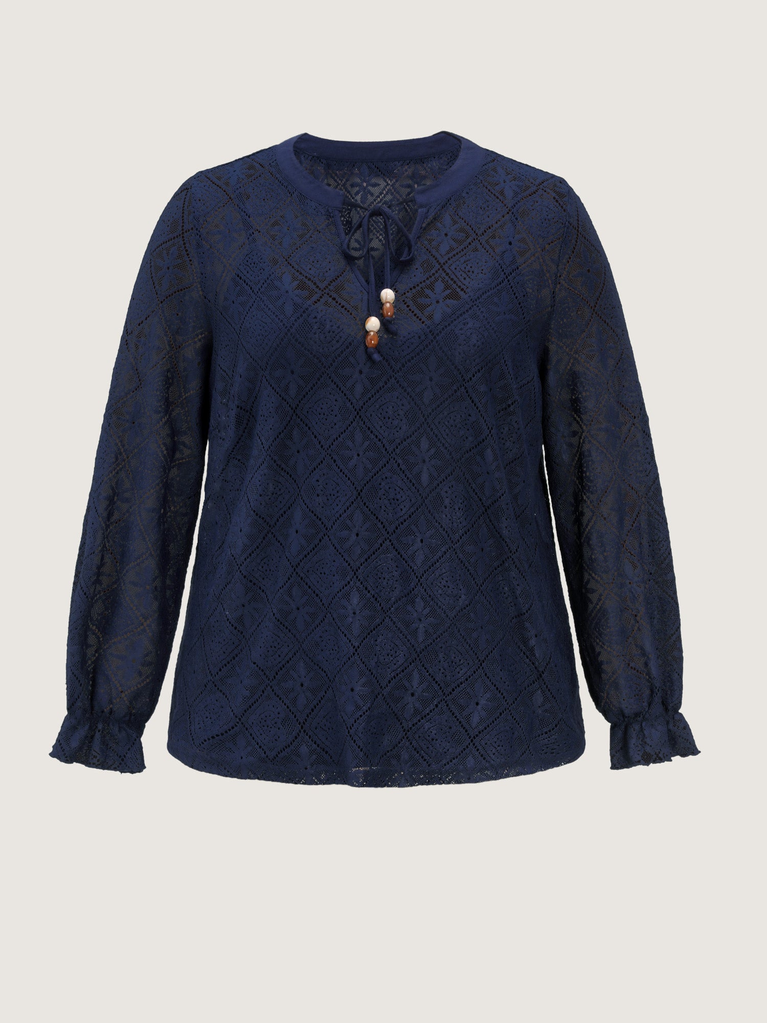 Shop Lace Sheer Neck-Tie Top now and redefine your style with confidence at BloomChic. Tailored for mid and plus-size women. This trendy Tops Women, sizes 10-30. Color:Indigo;Style:Timeless;Prints:Synthetic texture;Neckline:Flat collar with V-notch;Sleeve Type:Lantern Sleeve;Details:Texture, See through, Knotted;Pocket:No-pocket