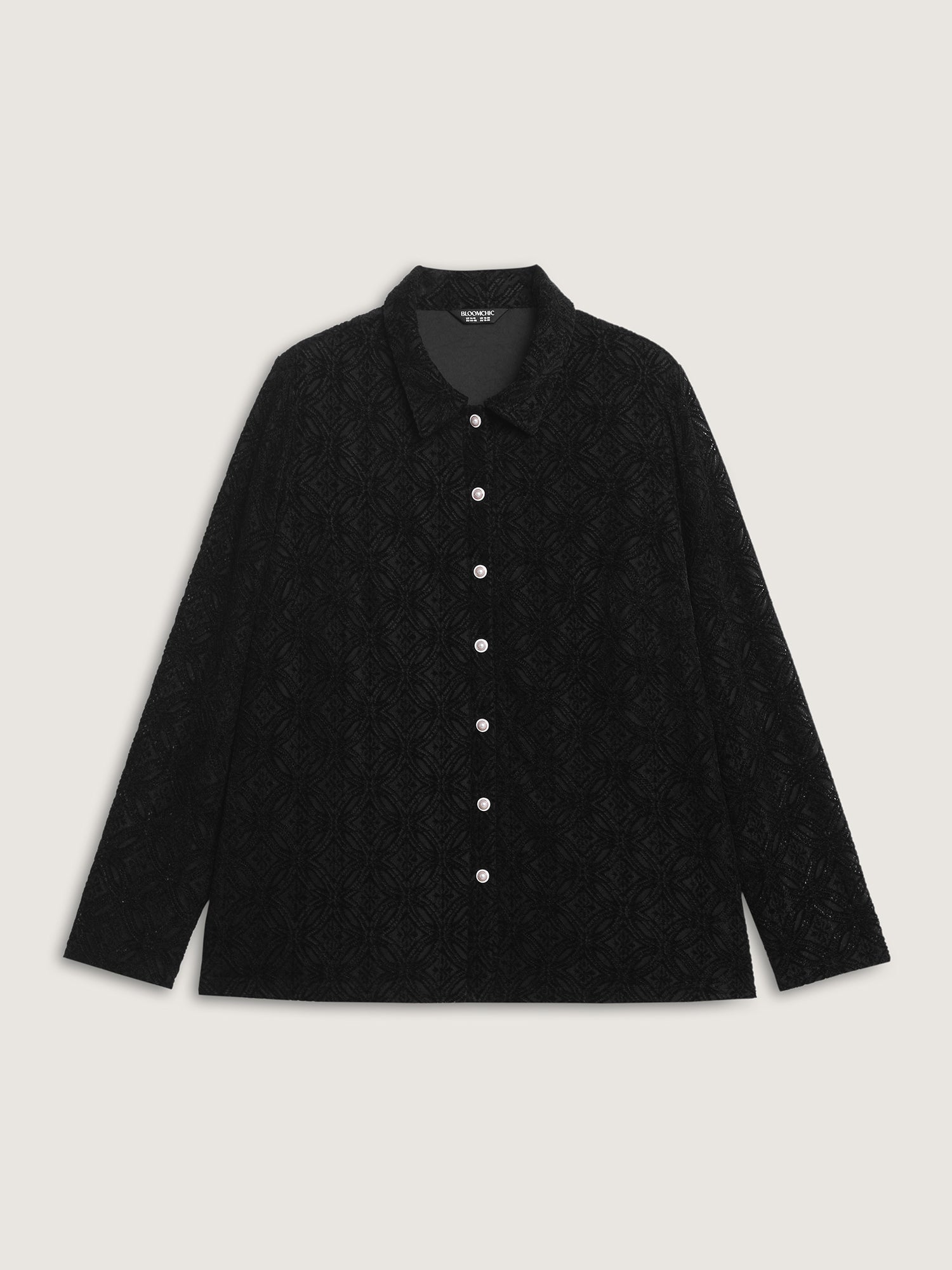 Shop Sheer Lace Button-Down Shirt now and redefine your style with confidence at BloomChic. Tailored for mid and plus-size women. This trendy Tops Women, sizes 10-30. Color:Black;Style:Timeless;Prints:Synthetic texture;Neckline:Shirt collar;Sleeve Type:Regular Sleeve;Details:Button, Texture;Pocket:No-pocket