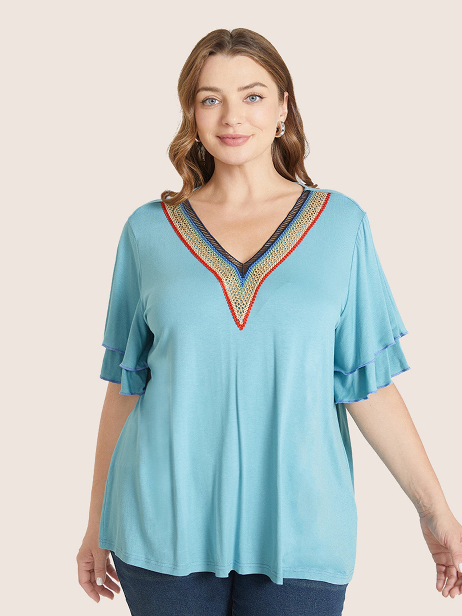 Shop Solid Crochet Lace Ruffle Tiered Sleeve V Neck T-shirt at BloomChic. Plus Size Clothing & Plus Size Jersey Tops. BloomChic is a digital-first fashion and lifestyle destination for modern women sizes 10-30.