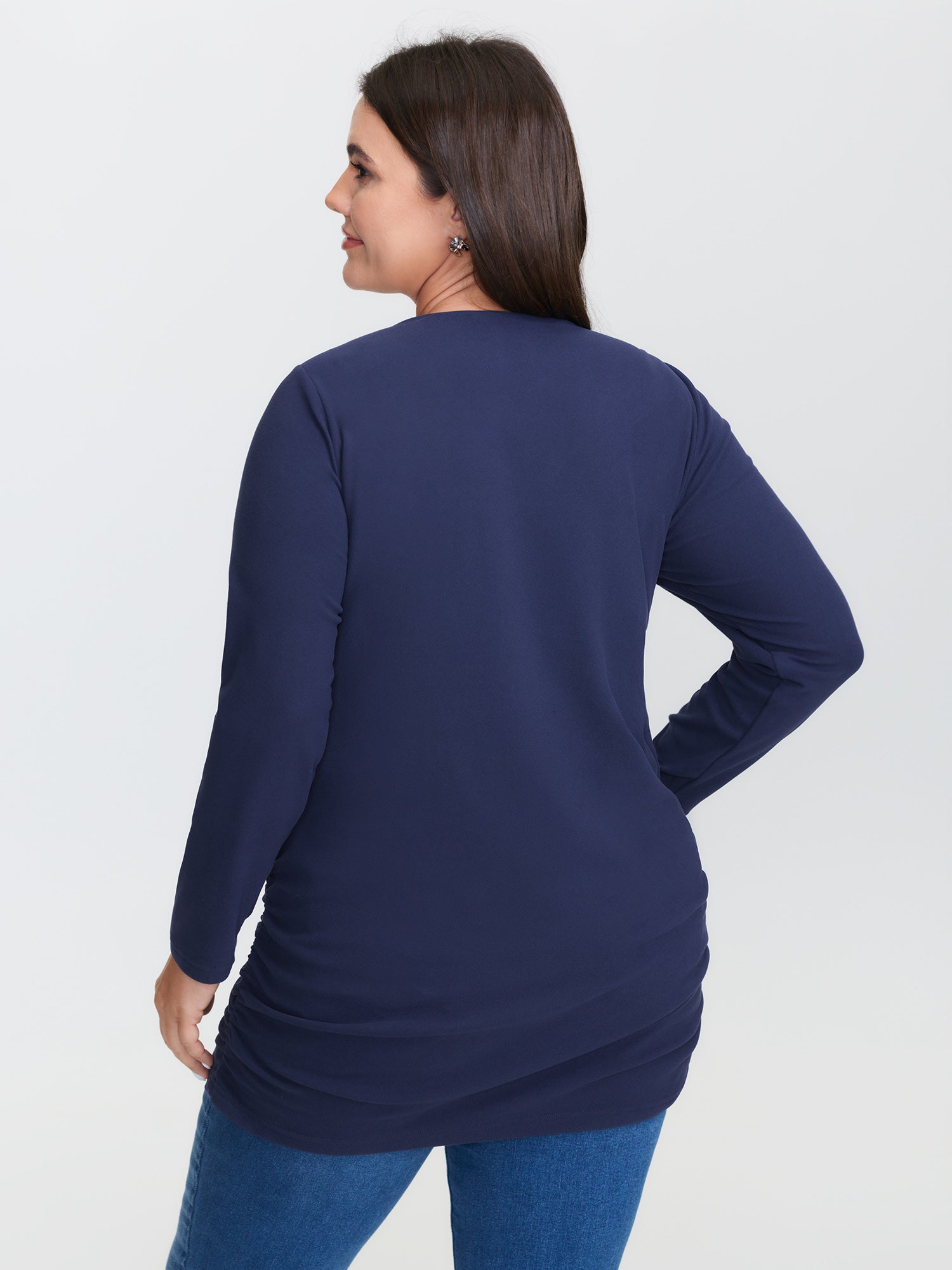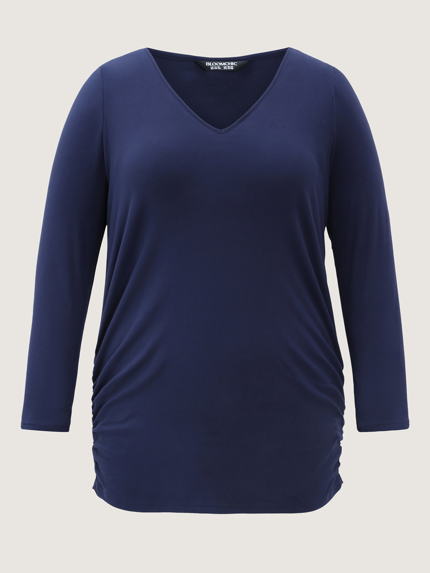 Shop Stretchy Brushed Fabric Ruched T-Shirt now and redefine your style with confidence at BloomChic. Tailored for mid and plus-size women. This trendy Tops Women, sizes 10-30. Color:Indigo;Style:Leisure;Prints:Non;Neckline:V-neck;Sleeve Type:Regular Sleeve;Details:Gathered;Pocket:No-pocket;Snap Fastener:No-snap fastener