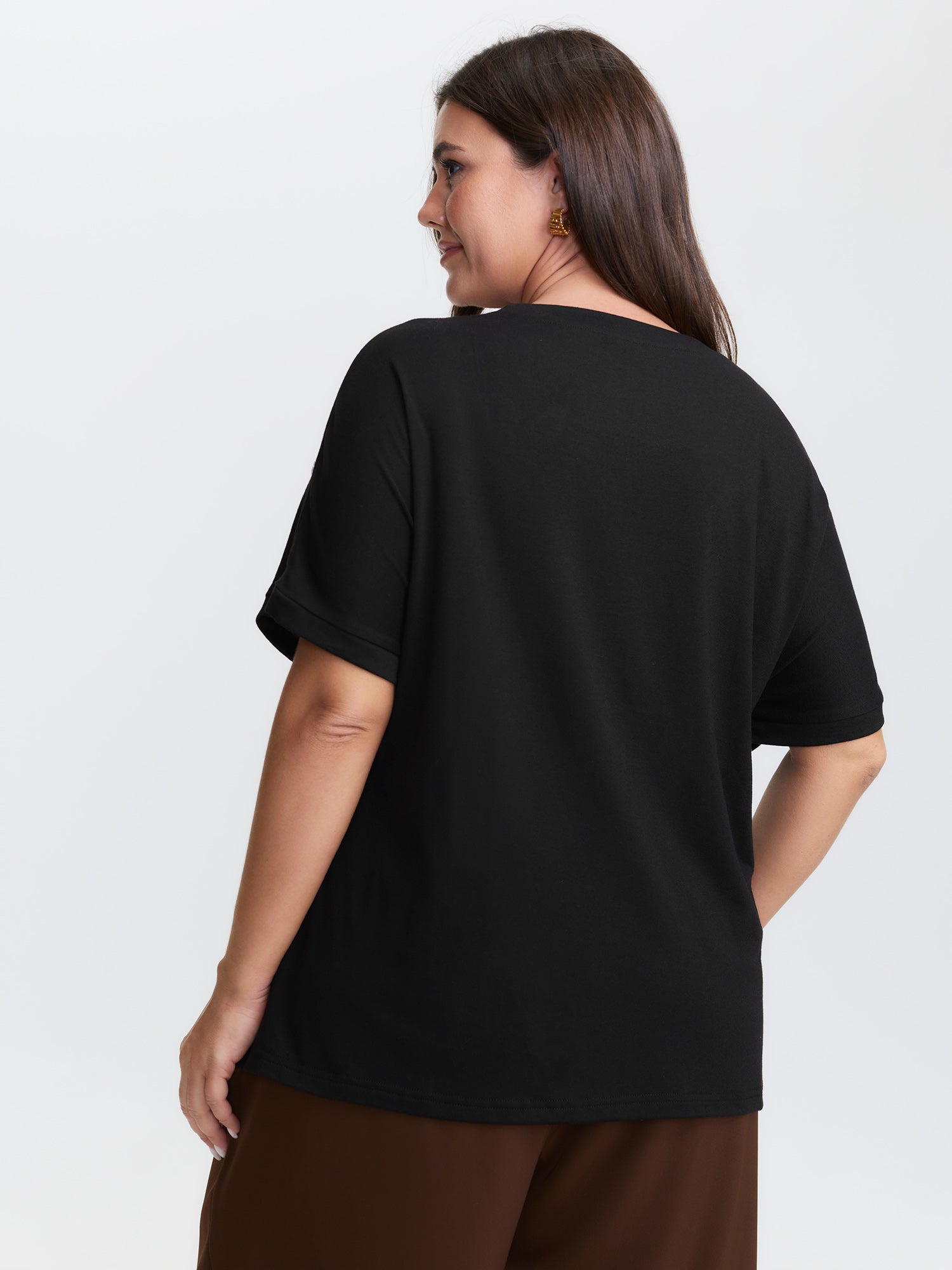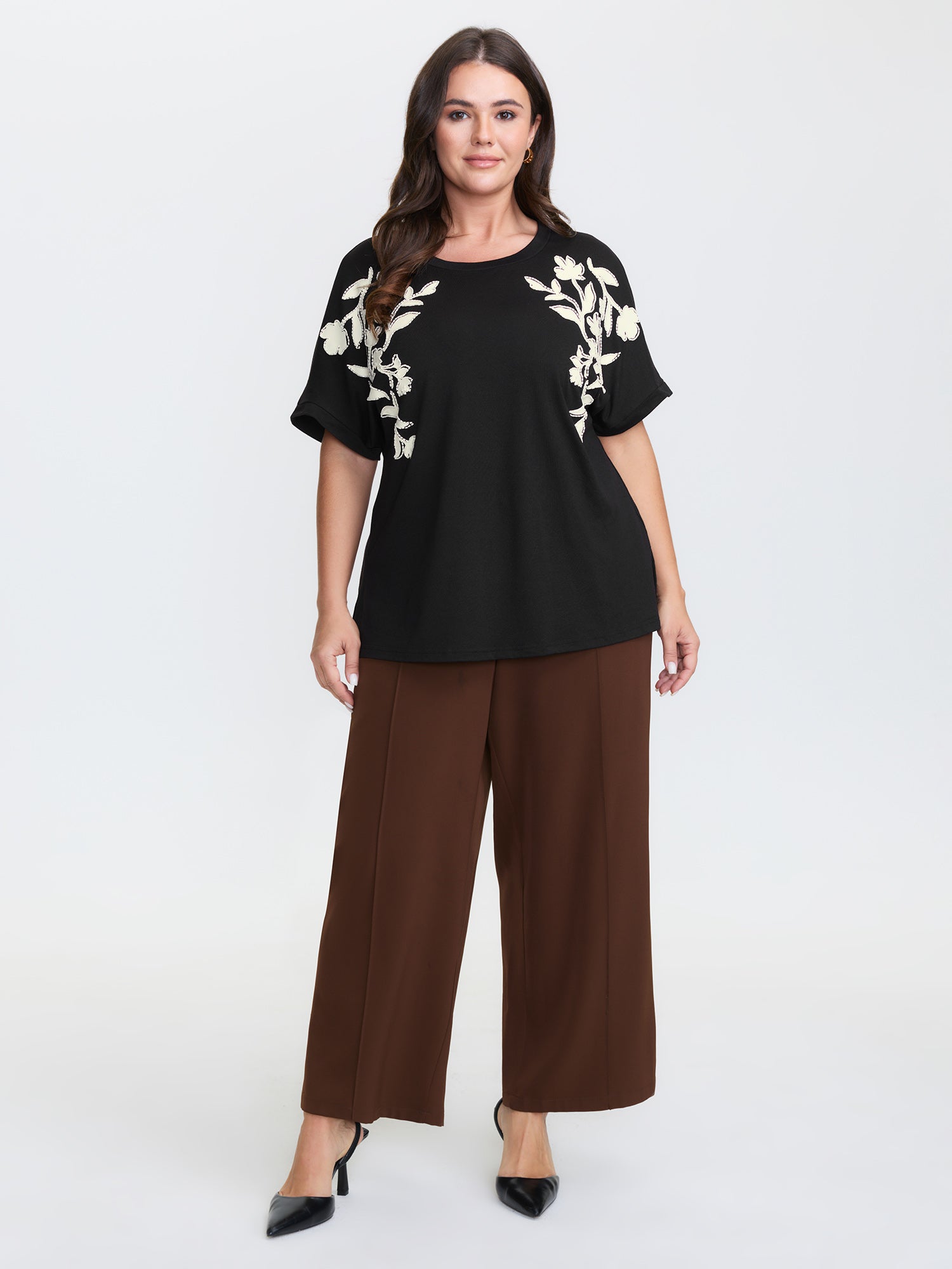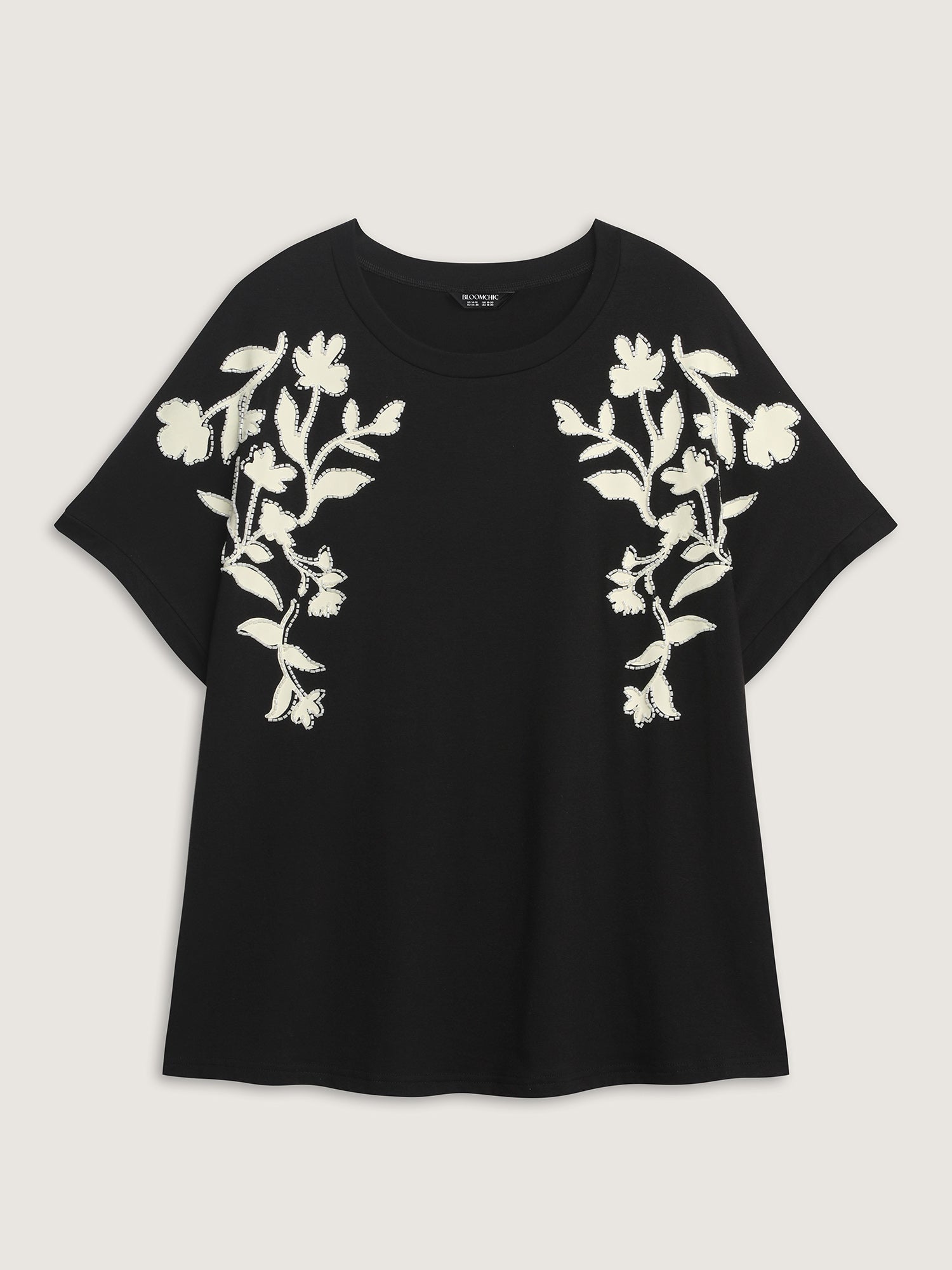 Shop Supersoft Floral Embroidered Round Neck T-Shirt now and redefine your style with confidence at BloomChic. Tailored for mid and plus-size women. This trendy Tops Women, sizes 10-30. Color:Black;Style:Timeless;Prints:Synthetic texture;Neckline:Round Neck;Sleeve Type:Drop shoulder sleeve;Pocket:No-pocket