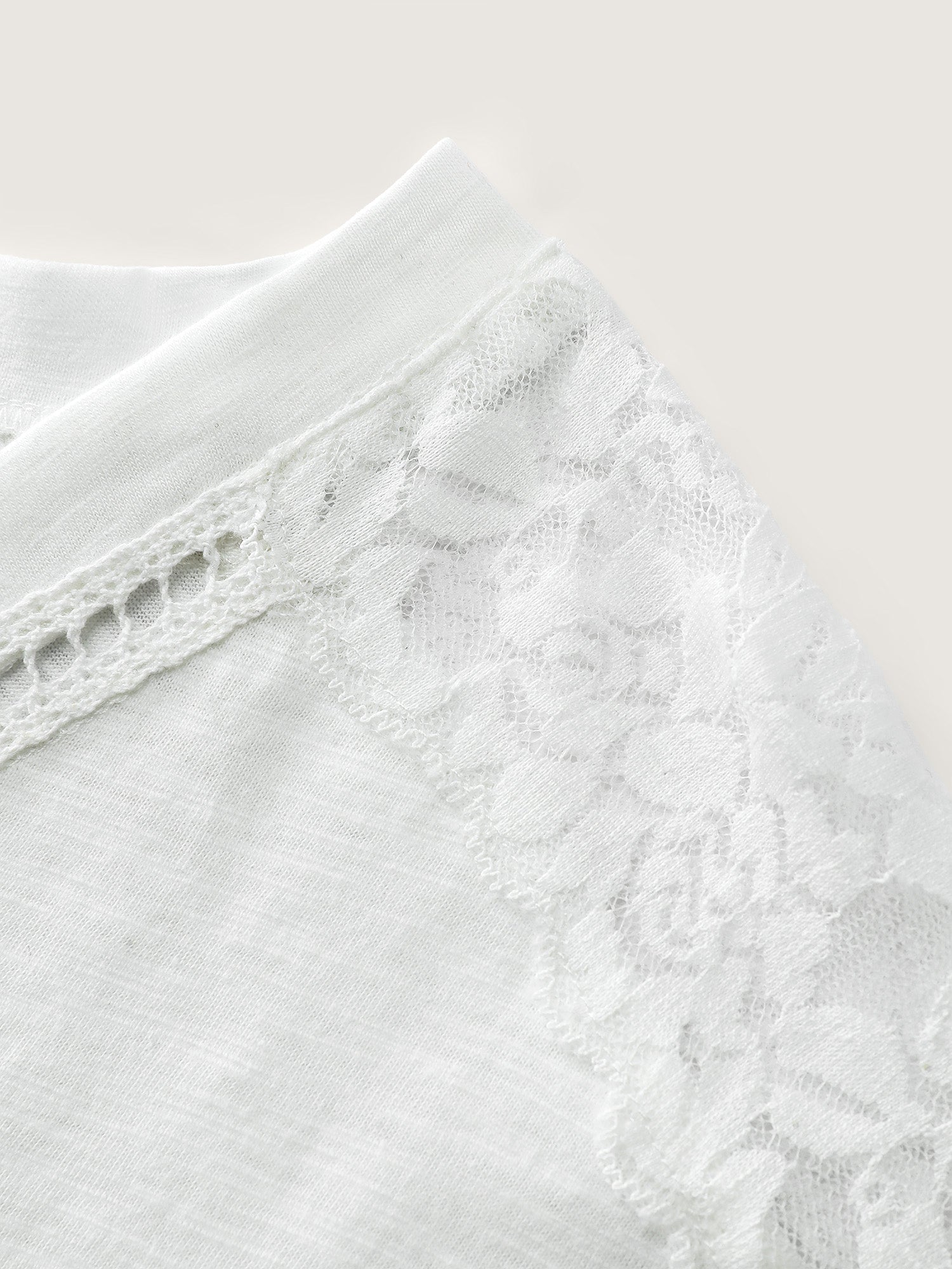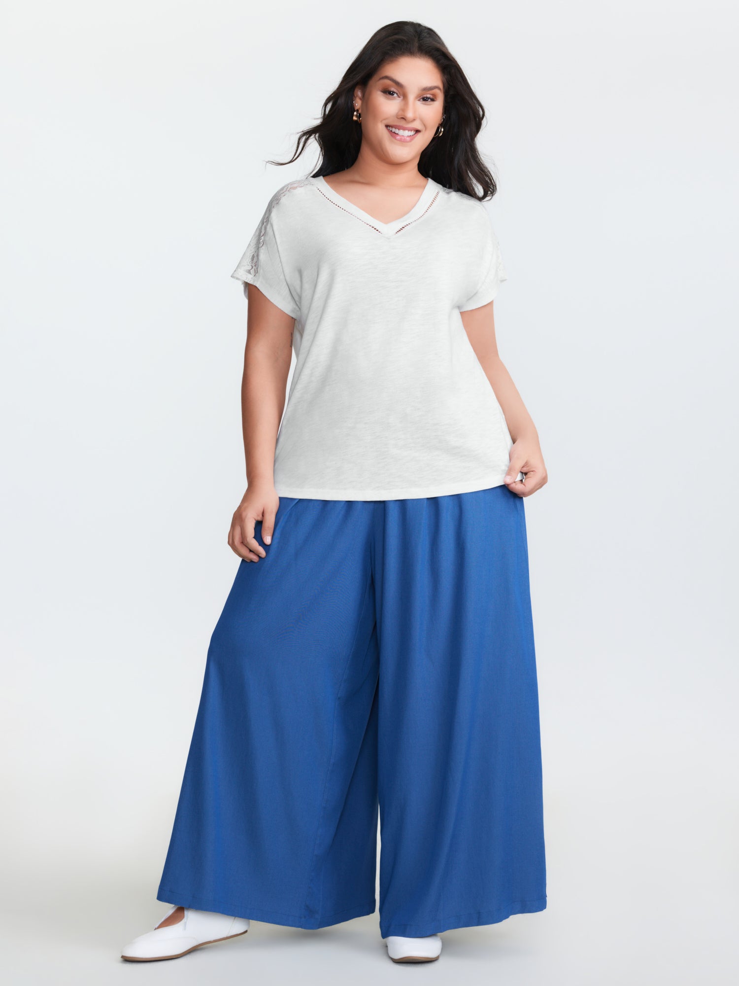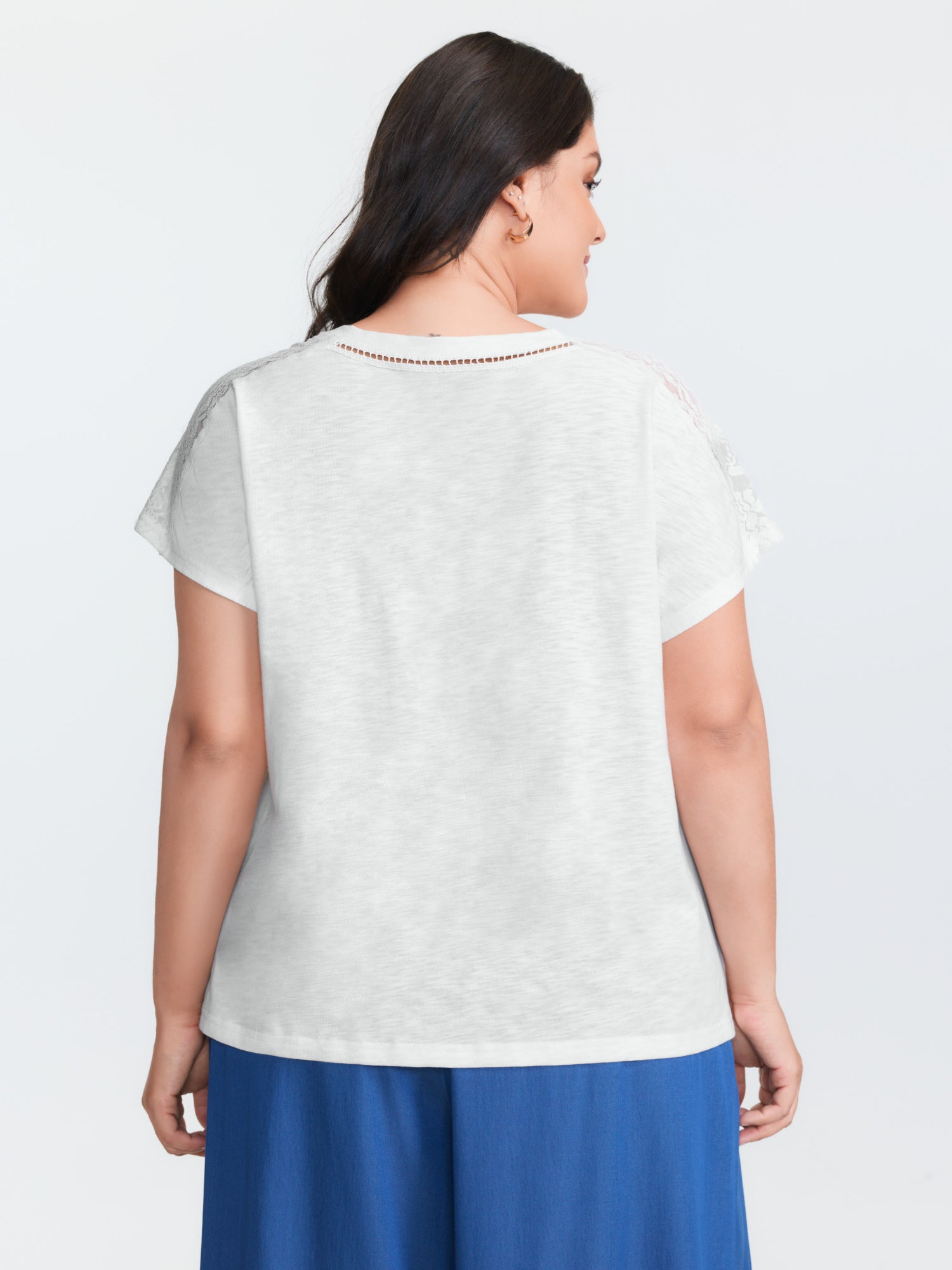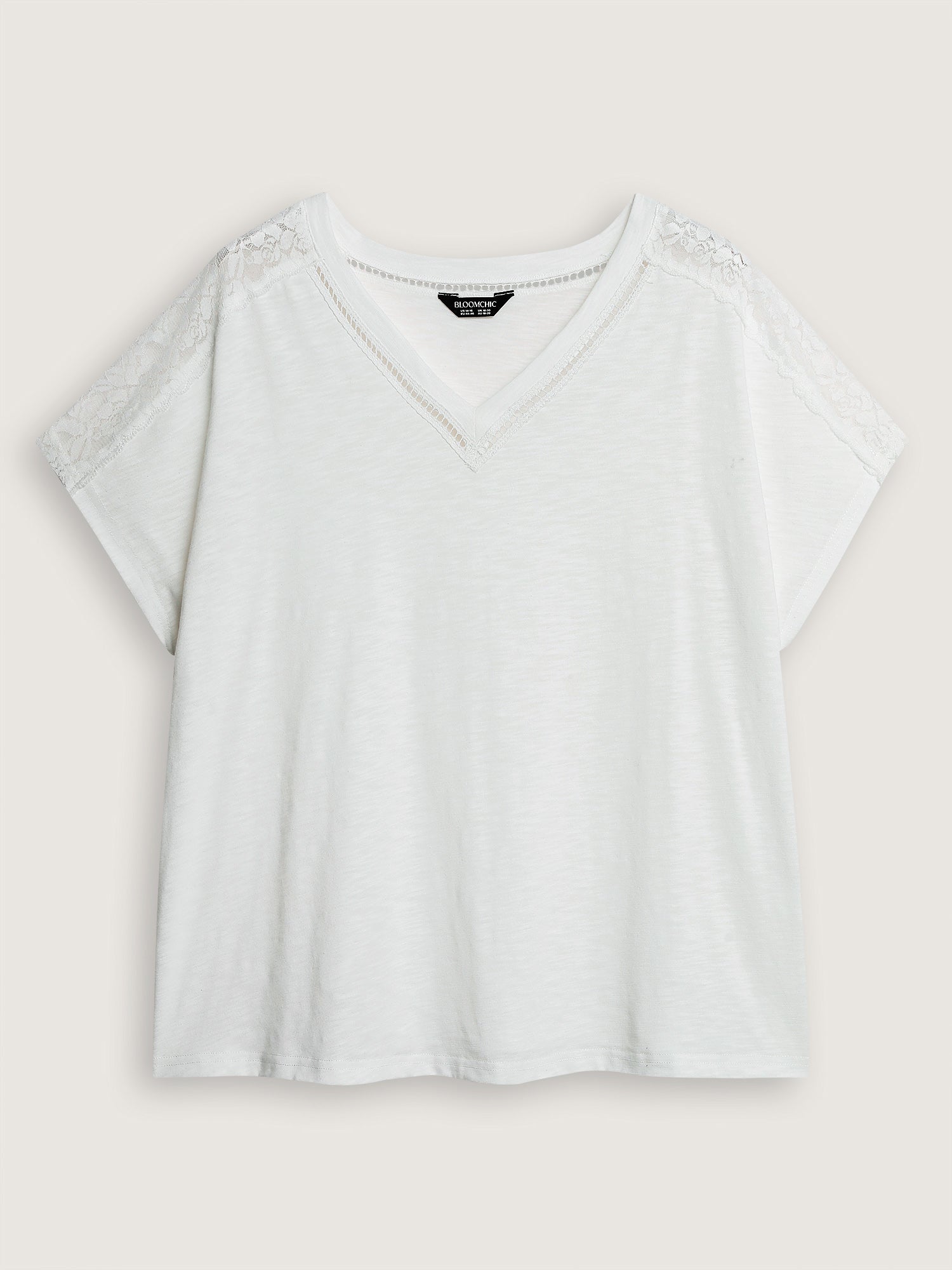 Shop Supersoft Sheer Lace Shoulder V-Neck T-Shirt now and redefine your style with confidence at BloomChic. Tailored for mid and plus-size women. This trendy Tops Women, sizes 10-30. Color:Optic White;Style_2:Leisure;Prints:Non;Neckline:V-neck;Sleeve Type:Dolman Sleeve;Details:Woven ribbon&lace trim, Cut-Out;Pocket:No-pocket