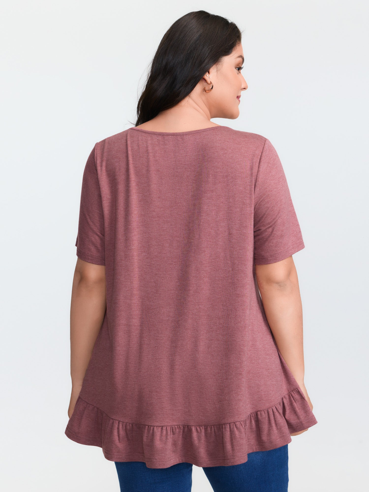 Shop Supersoft Stretchy Ruffled Hemline Button T-Shirt now and redefine your style with confidence at BloomChic. Tailored for mid and plus-size women. This trendy Tops Women, sizes 10-30. Color:Russet;Style_2:Leisure;Prints:Non;Neckline:Flat collar with V-notch;Sleeve Type:Regular Sleeve;Details:Button, Gathered;Pocket:No-pocket