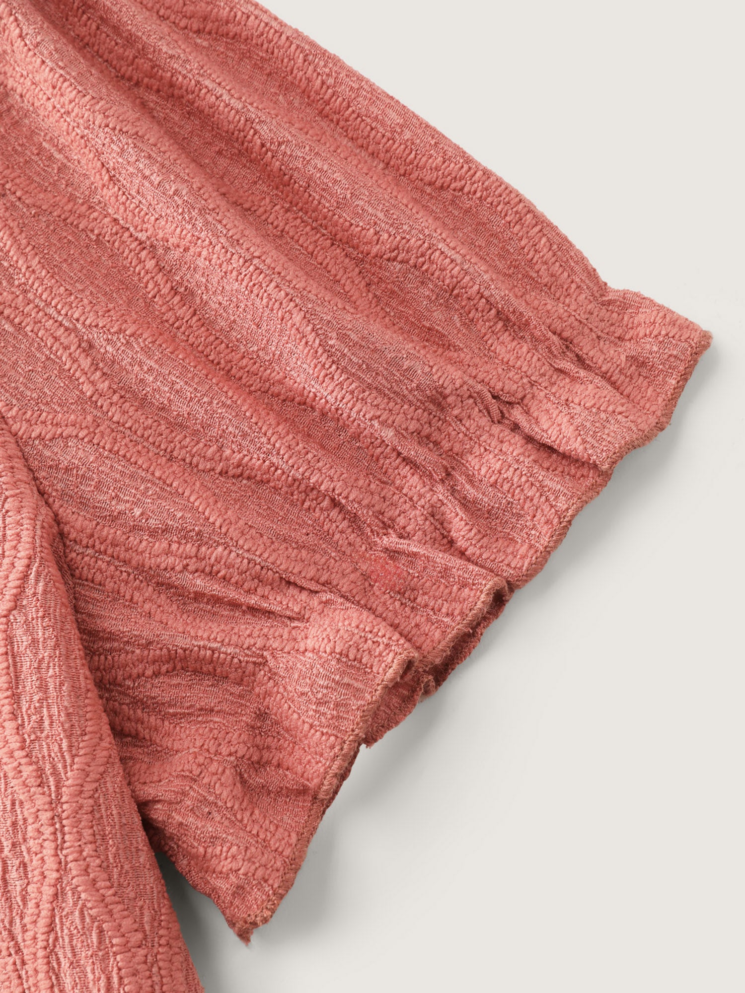 Textured Knot Placket Shirred Cuff Sleeve Top