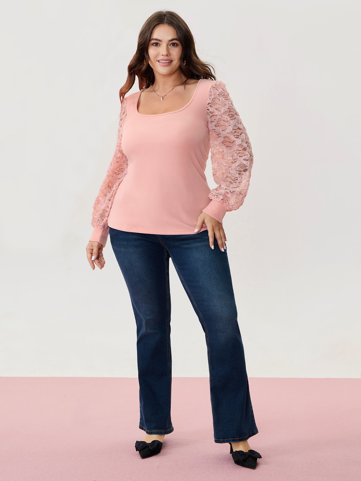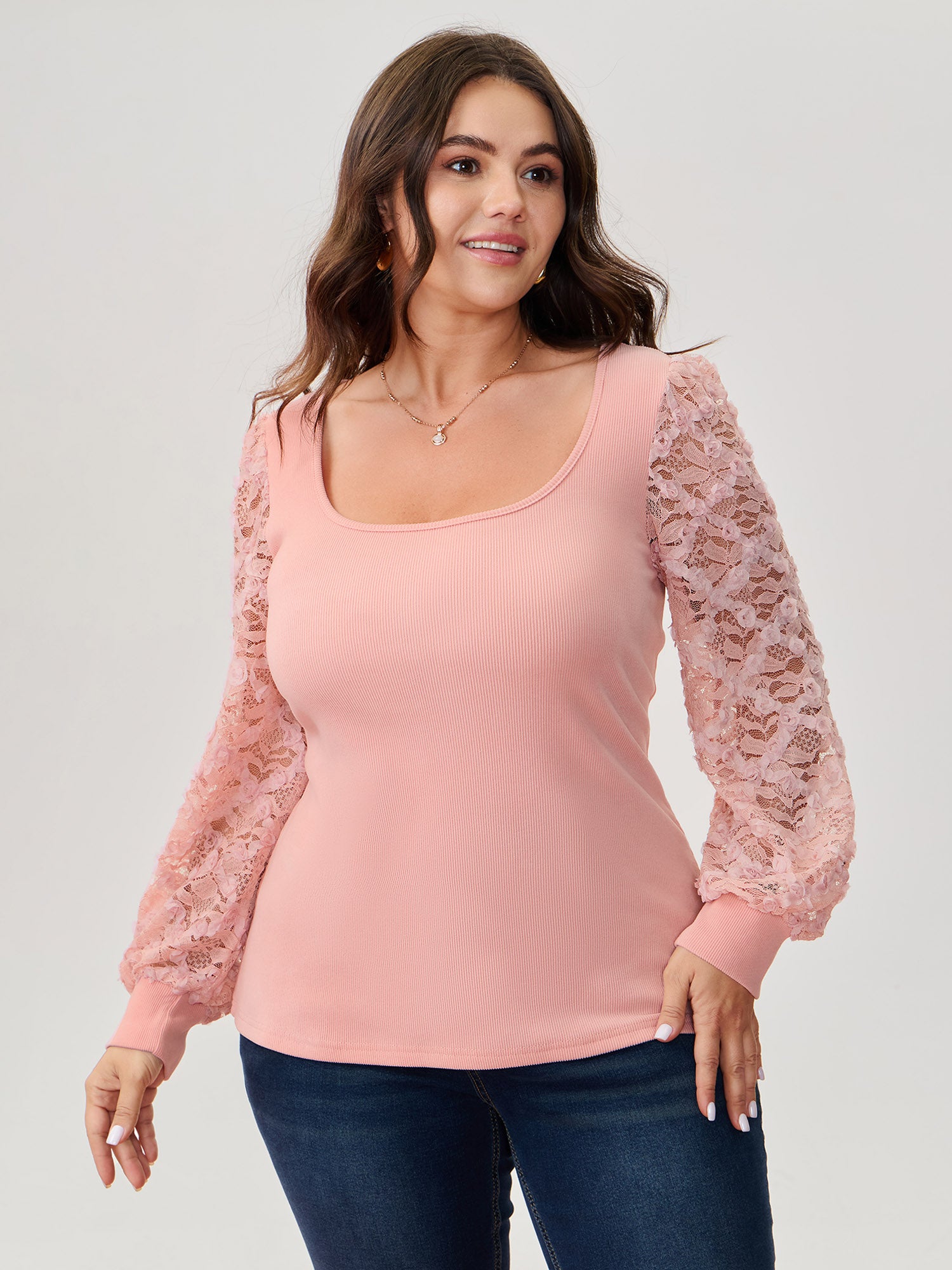 Lace Sleeve 3D Floral Knit Top